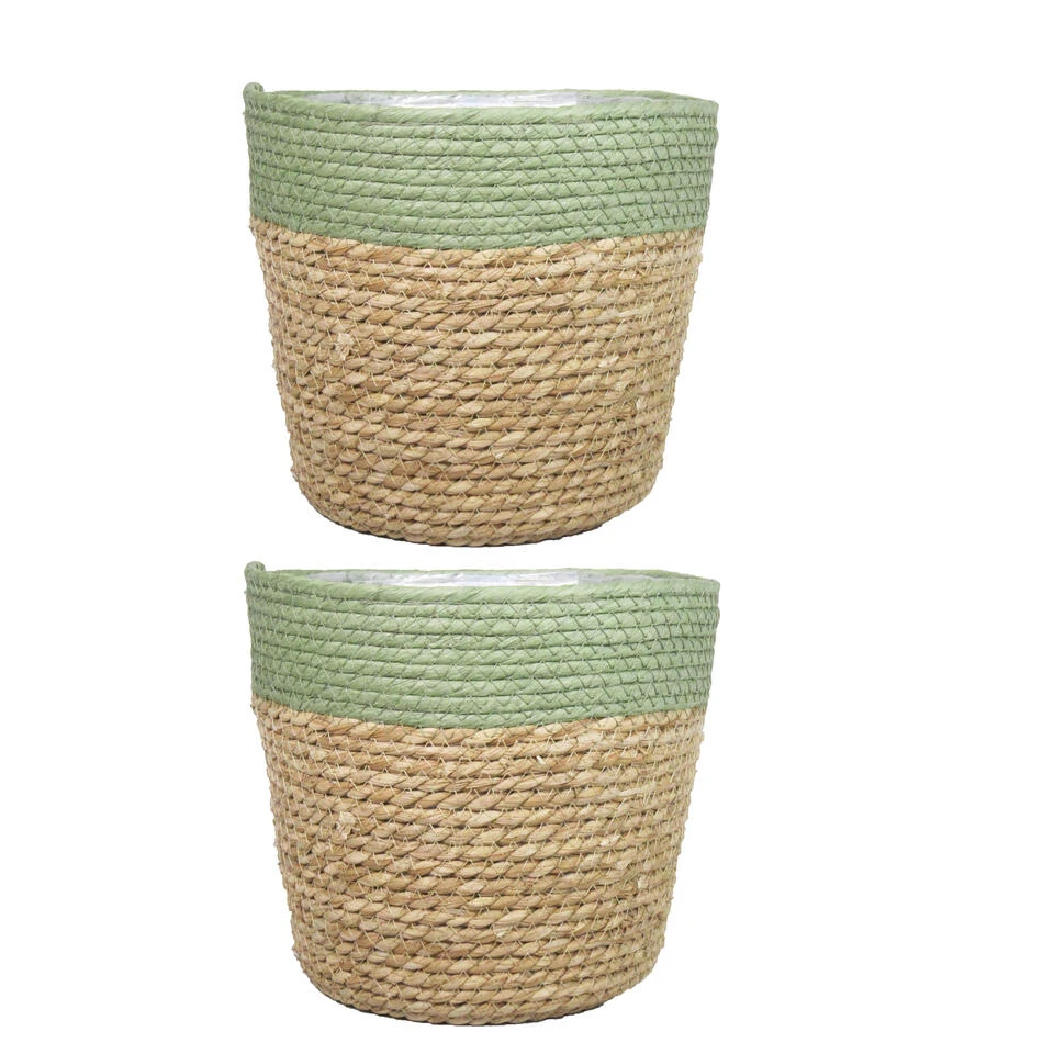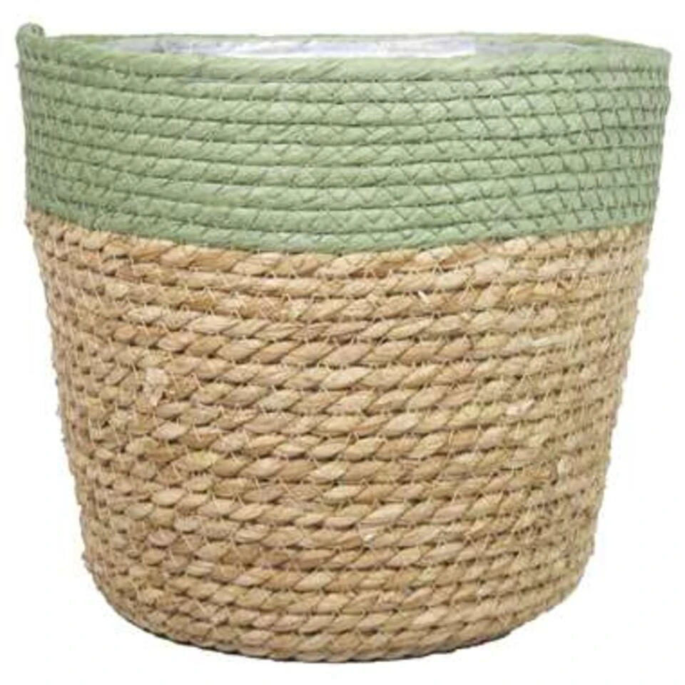 Naturel groen kleur rotan planten pot mand van gedraaid jute/touw/riet/zeegras van 16 cm hoogte en 19 cm diameter(buitenzijde). Voor de binnenmaat trek je 2 cm af. Mooie rotan jute manden/mandjes voor bloemen, bloemstukjes en planten met plastic aan de binnenkant zodat het water er niet door gaat. De ronde rieten mand heeft geen gaatjes aan de onderkant.