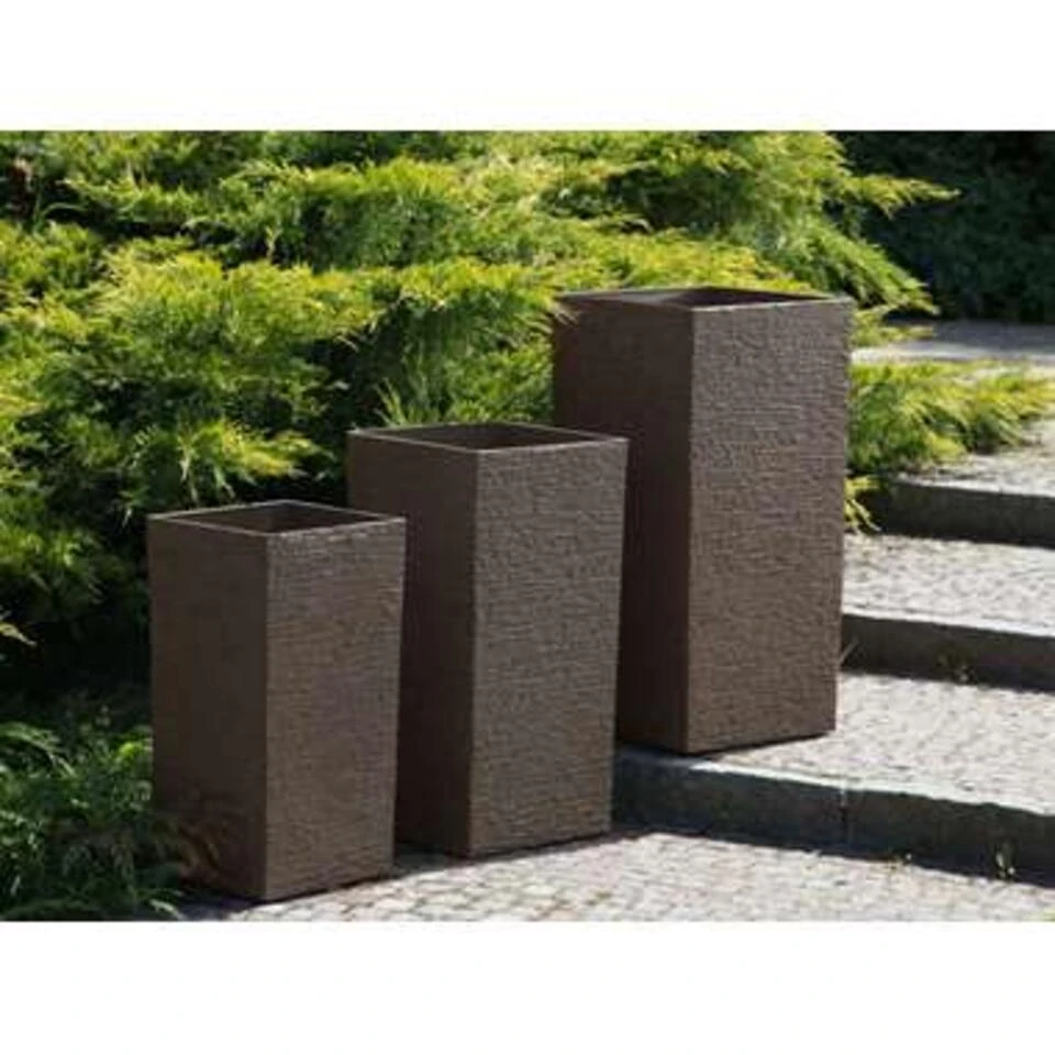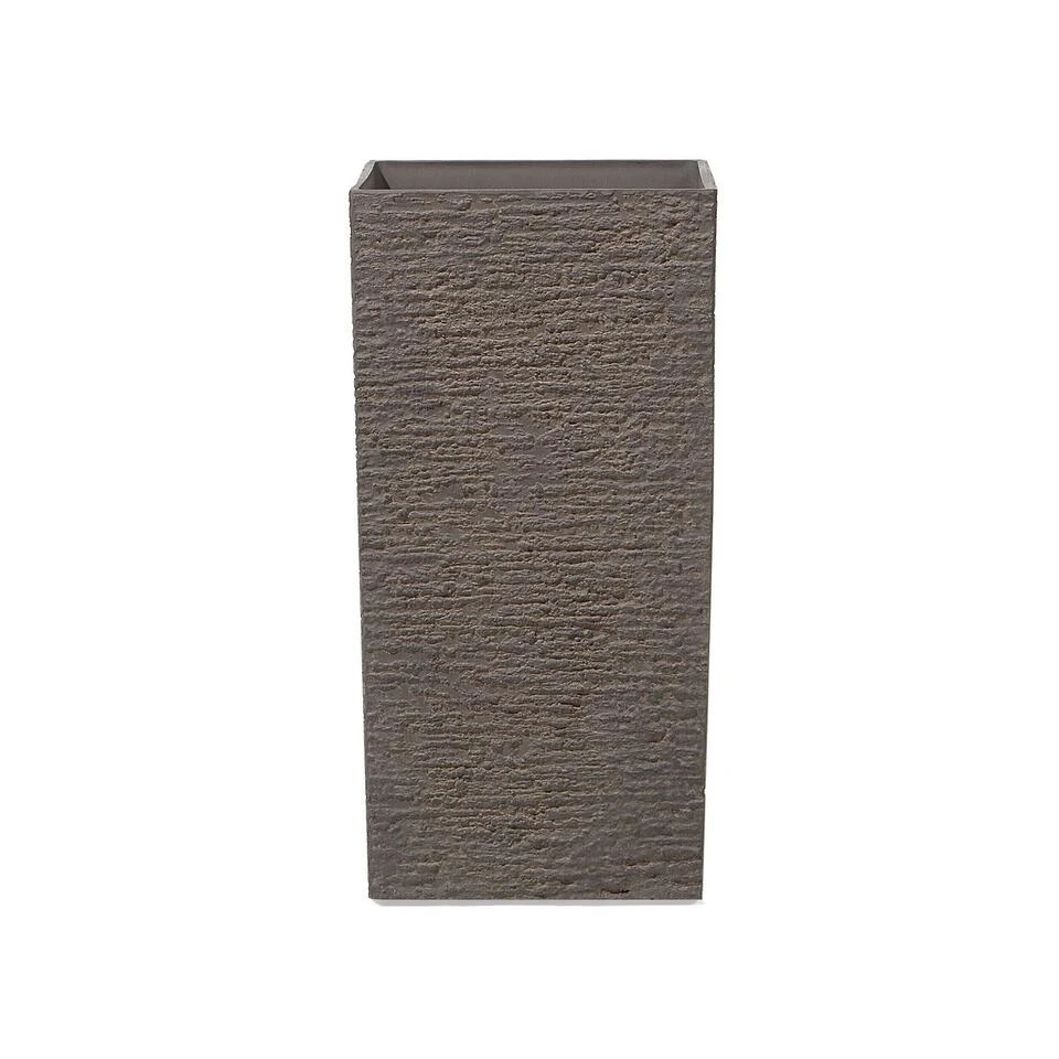 Hoge, vierkante plantenbak in donkerbruin, hoogte 70 cm. Een grote, vierkante bloempot is een populaire oplossing om het terras en de entree er wat sfeervoller uit te laten zien, maar staat ook erg leuk in kantoorruimten en openbare gebouwen. De lange, slanke vorm, het eenvoudige ontwerp en het donkerbruine, getextureerde oppervlak geven de bloempot een tijdloze look. De plantenbak is flexibel in gebruik zowel binnens- als buitenshuis.Wanneer het in de tuin of op het terras wordt gebruikt, kan de gemarkeerde plek gemakkelijk worden doorboord. Op elk moment kan overtollig water dan uit de pot stromen. Met een plug die bij de levering is inbegrepen, kan de opening indien nodig opnieuw worden gesloten. Het materiaal bestaat uit een mengsel van steen, polyresin en glasvezel en is daarom robuust, UV-bestendig, gemakkelijk in onderhoud en weerbestendig, zelfs bij zeer hoge of zeer lage temperaturen.