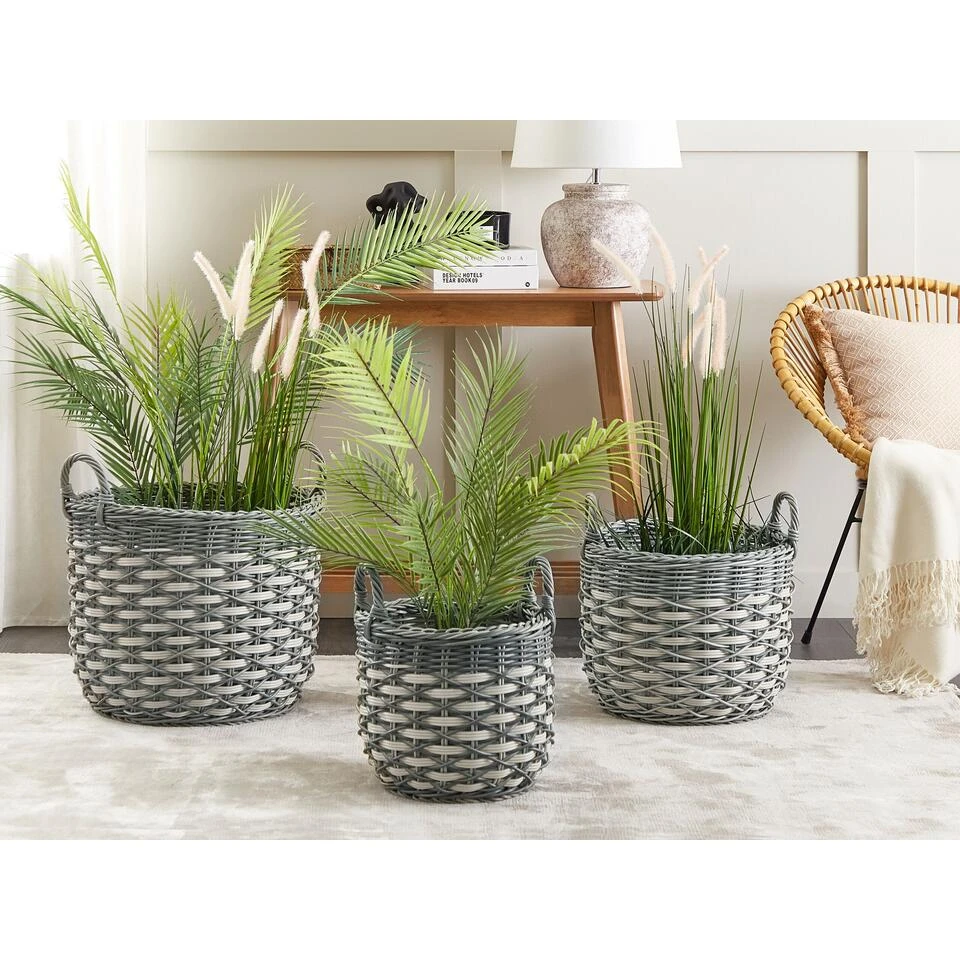 3 plantenpotten voor buiten met decoratief weefsel. Deze set van 3 mooie bloemenmanden is het perfecte hoogtepunt voor elke plant, groot of klein. Ze zijn gemaakt van duurzaam PE rotan en zijn verkrijgbaar in een tijdloze combinatie van grijs en wit. De potten hebben een mooie weving voor een klassieke uitstraling, terwijl de handvatten ervoor zorgen dat ze gemakkelijk te verplaatsen zijn. Elke mand is bekleed met een synthetisch materiaal om de vloer te beschermen tegen aarde en water. Of ze nu in de woonkamer of in de tuin staan, ze zullen zeker een prachtige aanvulling zijn op elke moderne omgeving.