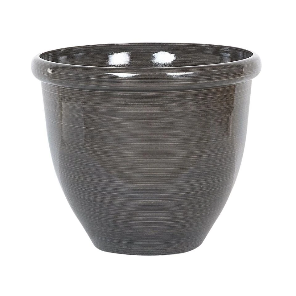 Ronde bloempot in donkerbruin. Verbeter je binnen- of buitenruimte met deze stijlvolle, moderne bloempot. Met de ronde vorm en hoogglans finish, zal deze bloempot ongetwijfeld in verschillende woonruimtes, de tuin of op het balkon zijn plekje vinden. De pot is gemaakt van een steen en glasvezel-mengsel, is UV-bestendig en bestand tegen verschillende temperaturen. Als je deze pot buiten gaat gebruiken, vergeet dan niet een gaatje te boren op de gemarkeerde plaats in de bodem.