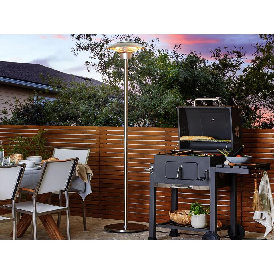 Staande Infrarode Verwarmingslamp. Ervaar het buiten zijn niet exclusief in de zomer, maar ook tijdens de koudere seizoenen. De terrasverwarmer is uitgerust met een dunne, ronde standaard, wat deze extreem stevig en ruimtebesparend maakt. Dankzij het strakke ontwerp van het apparaat wordt warmte efficiënt en gelijkmatig aan de omgeving afgegeven en bovendien niet door de wind verspreid.