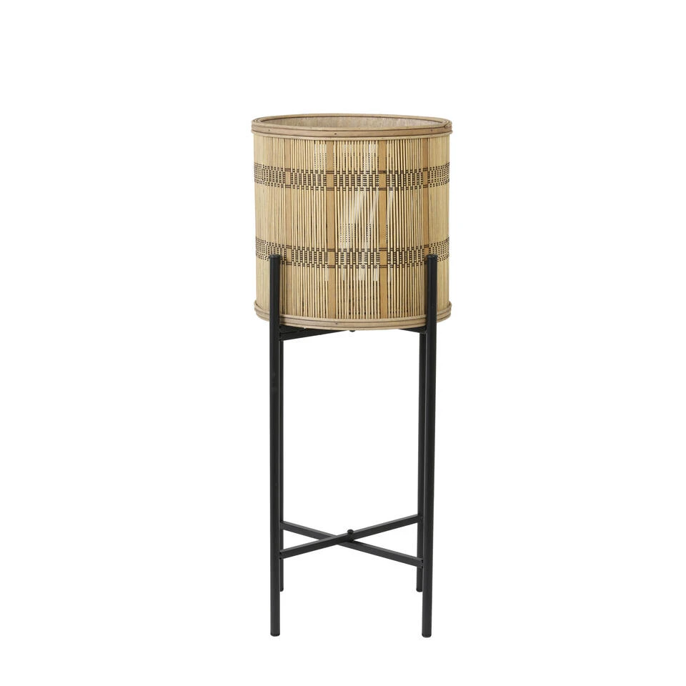 Houten bloempot op zwart metalen standaard