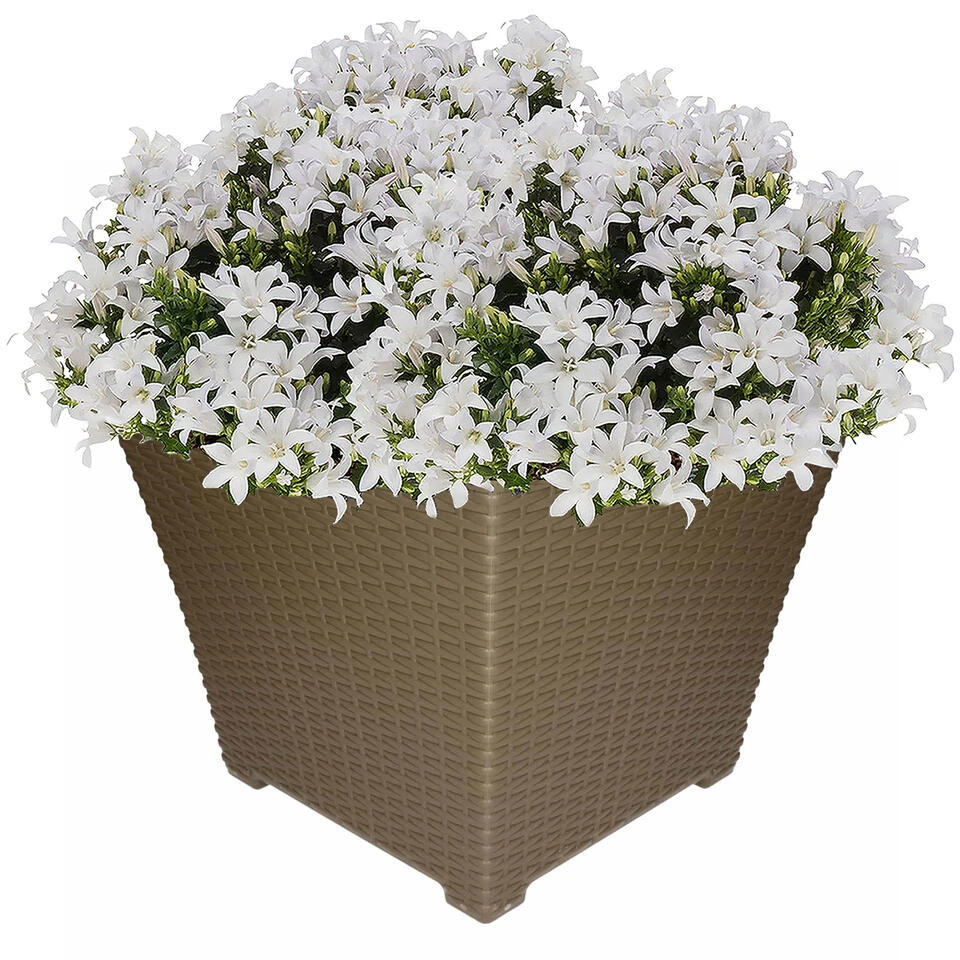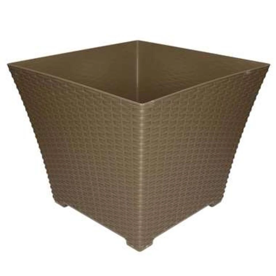 1x Taupe (beige/bruine) plantenbakken/bloempotten 37 cm. Gevlochten, kunststof plantenbak/bloembak in de kleur taupe. Het formaat van deze vierkanten bloemen/planten bak is ca. 37 x 37 x 32 cm. Materiaal: kunststof.