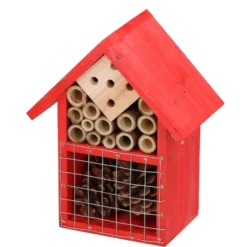 Een rood insecten hotel huisje voor vlinders, lieveheersbeestjes, kevers, duizendpoten, bijen et cetera. In dit insectenhotel kan het ongedierte uitrusten/overwinteren. Afmeting: ca. 16 x 9 x 19 cm. Materiaal: hout. Met ophangoogje. Dit diervriendelijke tuindecoratie accessoires bijenhuis/vlinderhuis insectenhotel draagt bij aan het ecosysteem en de biodiversiteit in uw tuin. Een habitat voor bestuivers en natuurlijke ongediertebestrijders. Een must-have voor tuinliefhebbers/natuurliefhebbers.
