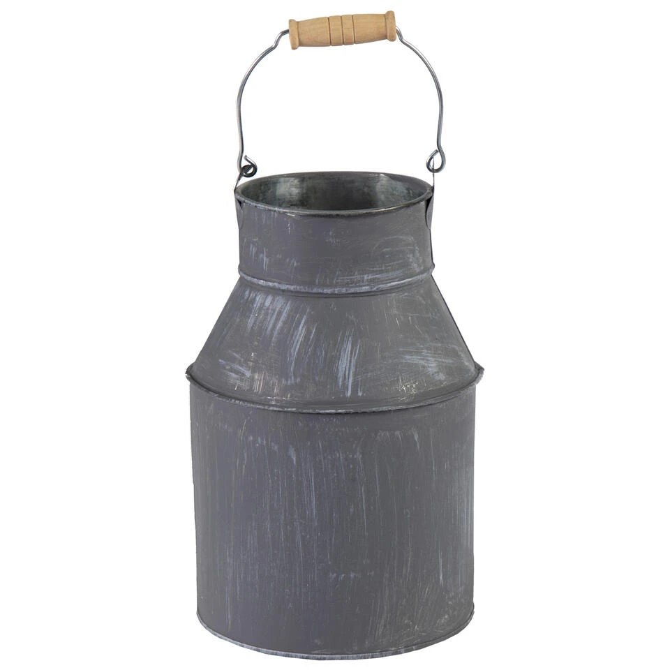 Melkbus plantenpot/bloempot gemaakt van zink in de kleur grijs met houten handvat. Melkbus uit de Bob serie kan zowel binnen als buiten gebruikt worden ter decoratie, maar ook geschikt als plantenpot/bloempot. Afmetingen: Diameter 13 cm en Hoogte 20 cm. Let op: zink is niet 100% waterdicht.