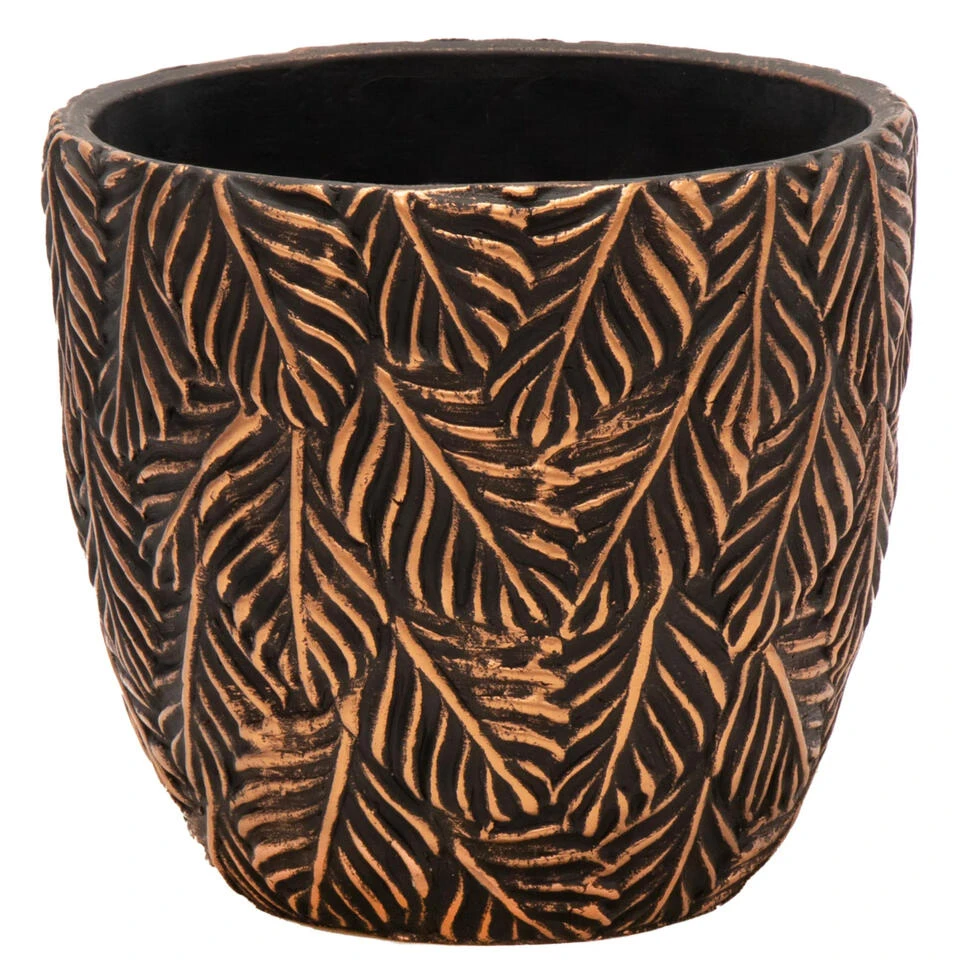 Plantenpot/bloempot in de kleur antraciet grijs/brons met aan de buitenzijde een print van bladmotief gemaakt van keramiek. De prachtige bloempot uit de Adana Egg serie is een verrijking voor uw interieur. Afmetingen: Diameter 22.5 cm en Hoogte 21 cm. De pot is voor binnengebruik.
