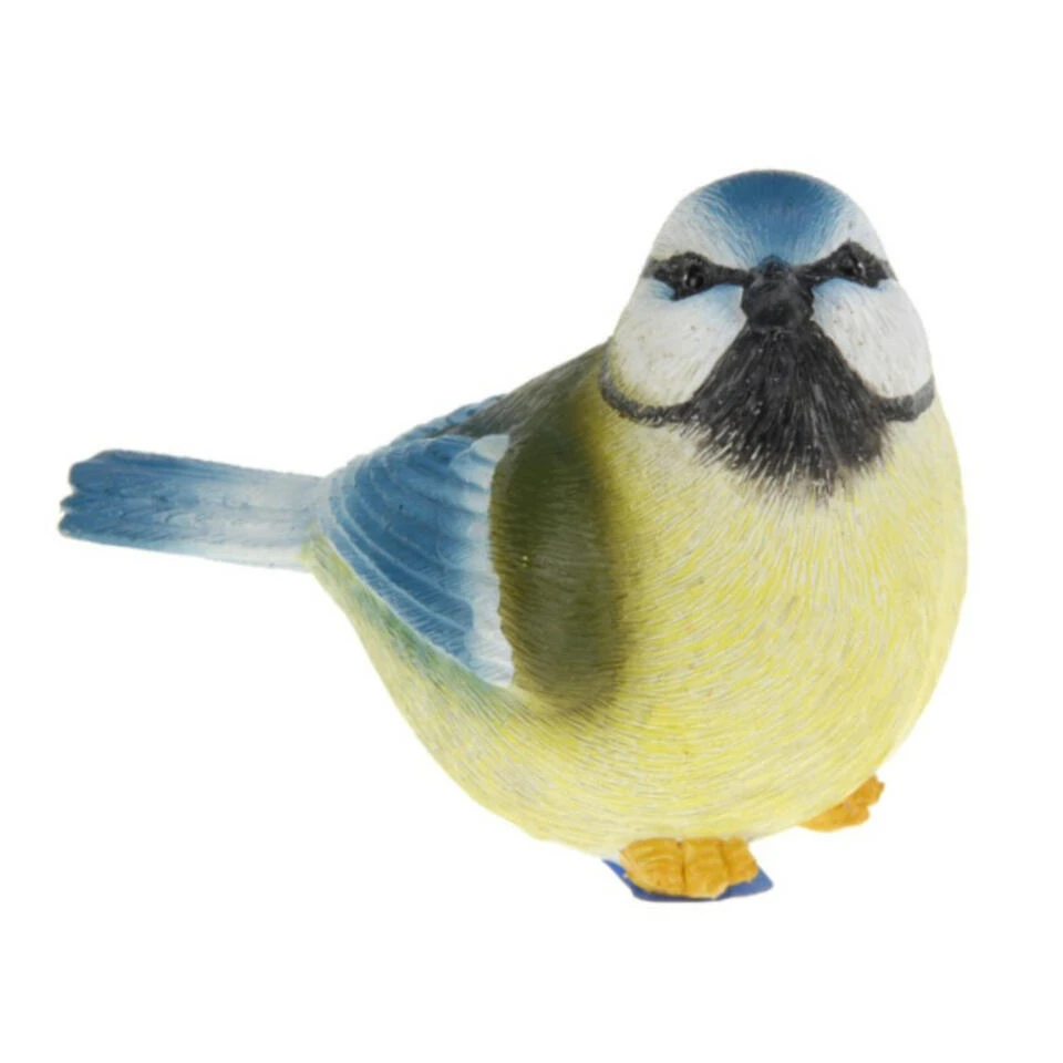 Decoratie Tuinbeeld van een vogeltje, type pimpelmees. Dit dieren beeldje/deco stuk is gemaakt van polystone en ongeveer 13 cm. Deze beeldjes zijn geschikt voor binnen in huis en/of buiten in de tuin. Super sfeervol en kleurrijk, echt een aanwinst in uw tuin.