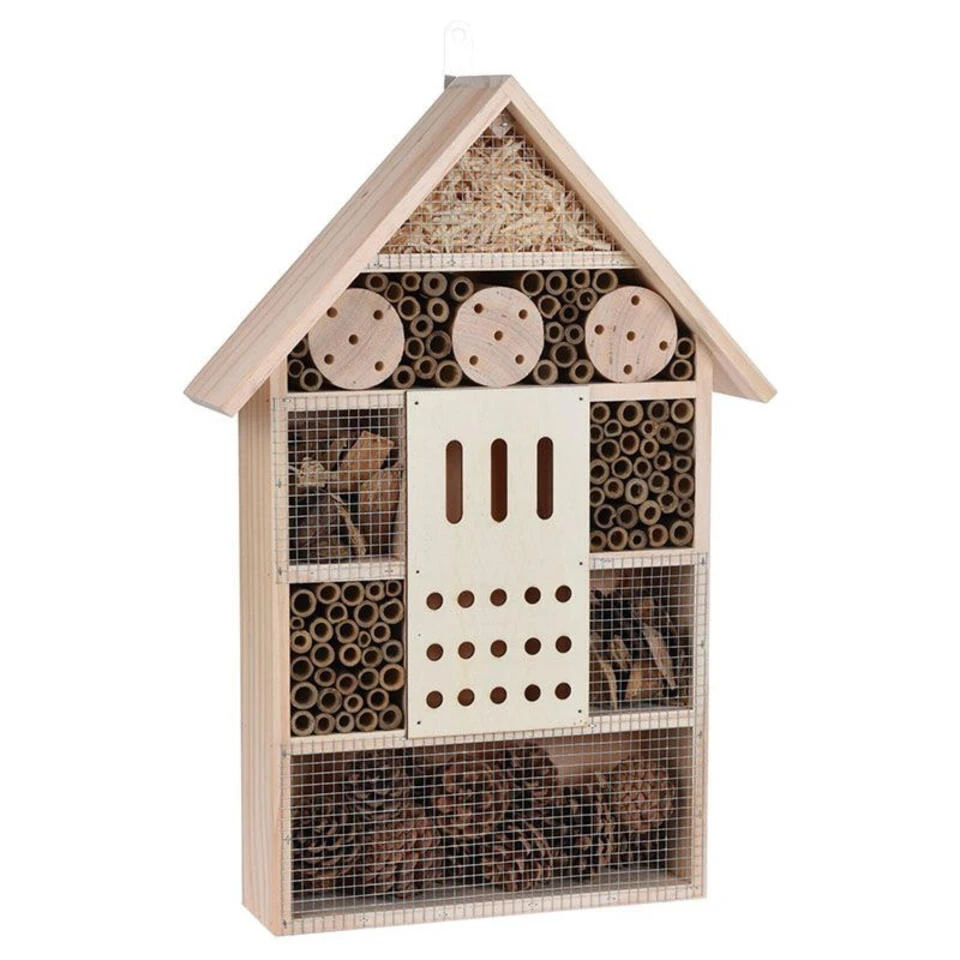 Groot insectenhotel huis 51 cm. Een insecten hotel huisje voor bijen, vlinders, lieveheersbeestjes, kevers, duizendpoten en andere insecten. In dit insectenhotel kan het ongedierte uitrusten/overwinteren. Afmeting: ca. 51 x 35 x 10 cm. Materiaal: dennenhout en draad. Met ophangsysteem. Dit diervriendelijke tuindecoratie accessoires bijenhuis/vlinderhuis insectenhotel draagt bij aan het ecosysteem en de biodiversiteit in uw tuin. Een habitat voor bestuivers en natuurlijke ongediertebestrijders. Een must-have voor tuinliefhebbers/natuurliefhebbers.