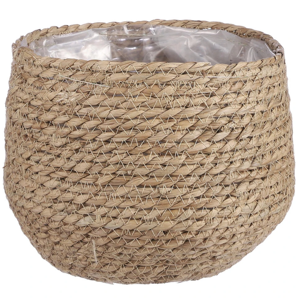 Naturel beige kleur rotan planten pot mand van gedraaid jute/touw/riet/zeegras van 19 cm hoogte en 22 cm diameter(buitenzijde). Voor de binnenmaat trek je 3 cm af. Mooie rotan jute manden/mandjes voor bloemen, bloemstukjes en planten met plastic aan de binnenkant zodat het water er niet door gaat. De ronde rieten mand heeft geen gaatjes aan de onderkant.