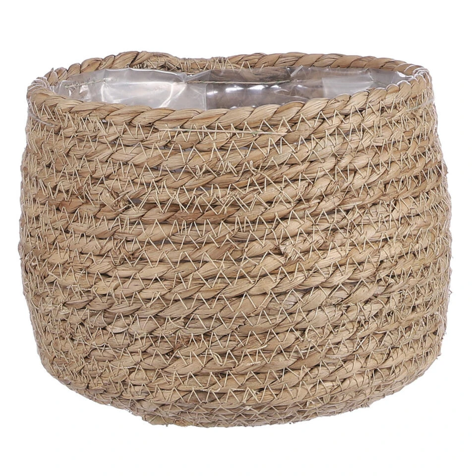 Naturel beige kleur rotan planten pot mand van gedraaid jute/touw/riet/zeegras van 15 cm hoogte en 18 cm diameter(buitenzijde). Voor de binnenmaat trek je 3 cm af. Mooie rotan jute manden/mandjes voor bloemen, bloemstukjes en planten met plastic aan de binnenkant zodat het water er niet door gaat. De ronde rieten mand heeft geen gaatjes aan de onderkant.