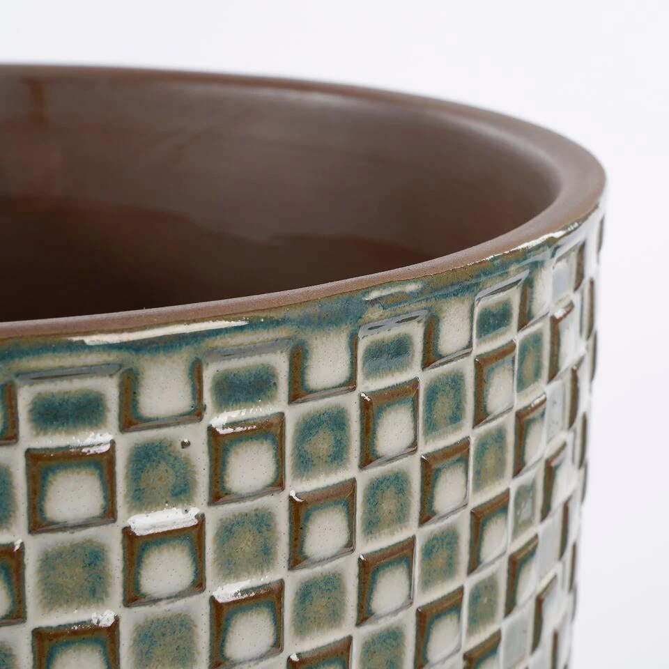 Bloempot Daan uit de collectie van Mica Decorations fleurt je interieur in een mum van tijd op. De keramieken pot is namelijk speels afgewerkt met een patroon van kleine vierkantjes. Erg mooi in combinatie met de subtiele glans! Daarnaast heeft de pot een frisse witte kleur die in elk huis wel een plekje weet te vinden. Welk plantje zet jij erin? De Daan potten zijn verkrijgbaar in verschillende kleuren en maten. Leuk om met elkaar te combineren! Deze bloempot is wit en heeft een afmeting van H17,5 x Ø19 cm.