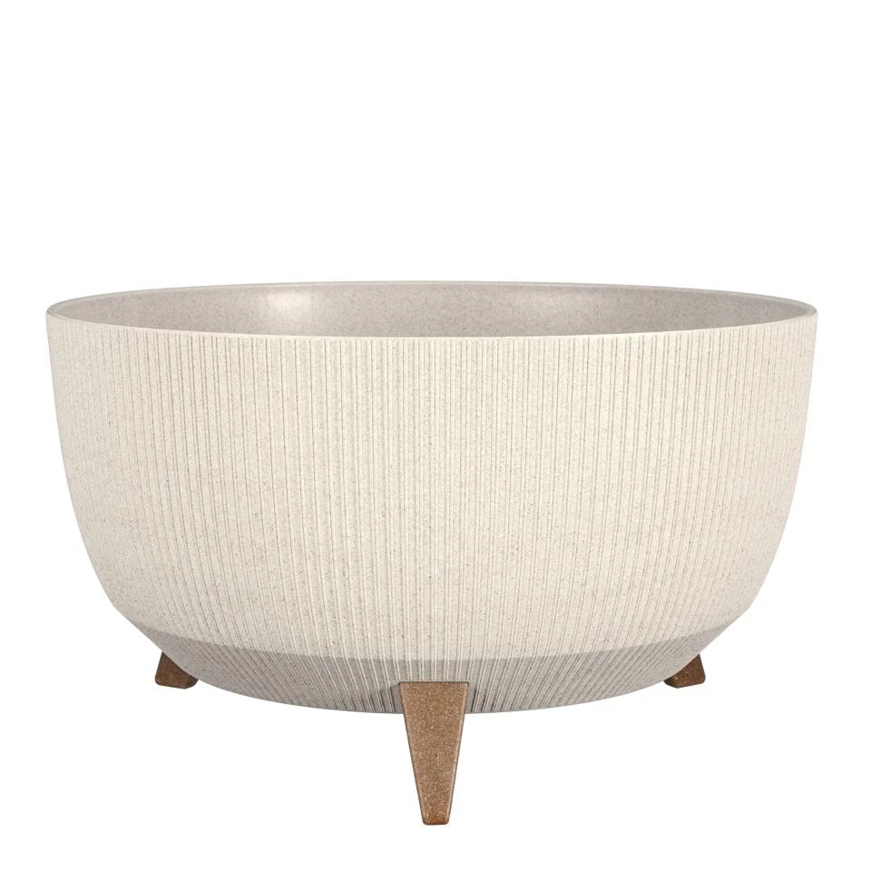 Geef jouw favoriete plant een prominente plek met deze Doppio schaal op poten van Mica Decorations. De off white pot bestaat voor 40% uit een mix van koffieschillen van restafval met gerecycled FSC®-gecertificeerd hout en voor 60% uit polypropyleen. De drie bruine pootjes zijn voor 40% gemaakt van gerecycled FSC®-gecertificeerd hout en 60% polypropyleen. De bloempot is daarnaast lichtgewicht, UV- en vorstbestendig. Door de uitneembare plug ontstaat er een drainagegat waardoor de pot een goede afwatering heeft. De pot is hierdoor geschikt voor zowel binnen als buiten. Erg mooi in combinatie met een kleurrijke plant. Deze off white bloempot op pootjes heeft een afmeting van H22 x Ø47 cm.