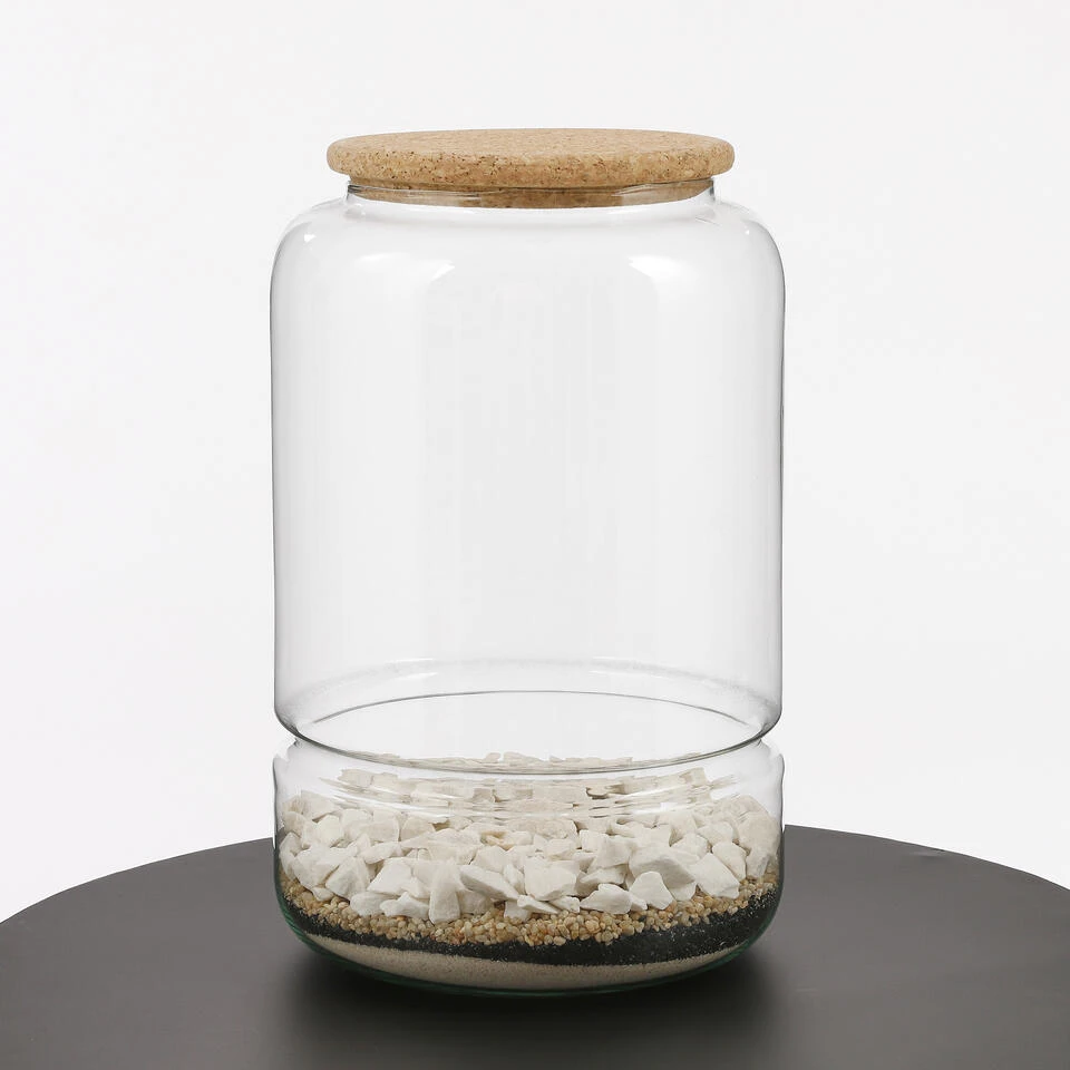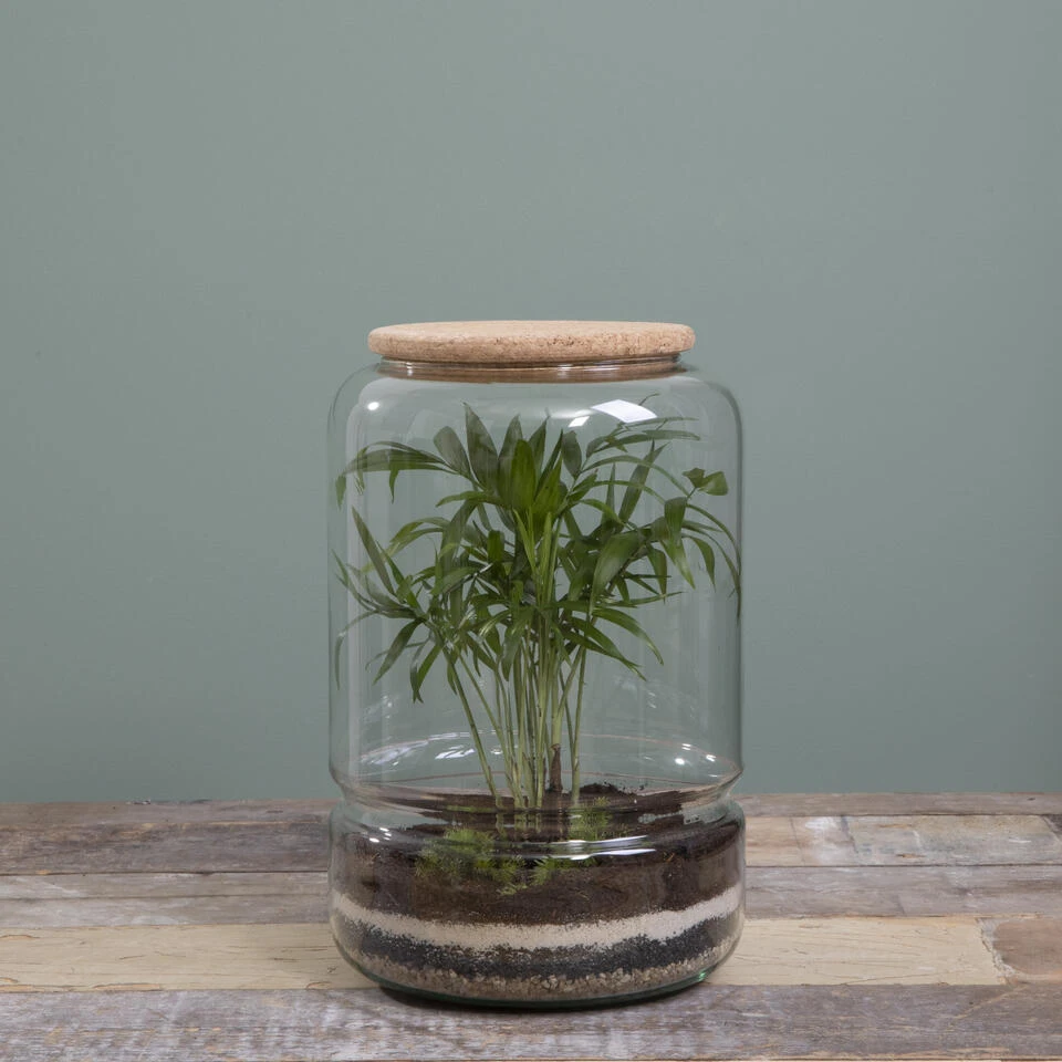 Helemaal fan van de groen-in-glas trend? Met dit item uit de collectie van Mica Decorations kun je jouw eigen terrarium creëren. De set bestaat uit een transparante vaas van gerecycled glas, een kurken deksel, mos, steentjes en aarde. Nu hoef je alleen nog maar wat plantjes uit te zoeken! De afmetingen van de glazen pot zijn H28 x Ø19 cm.