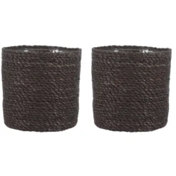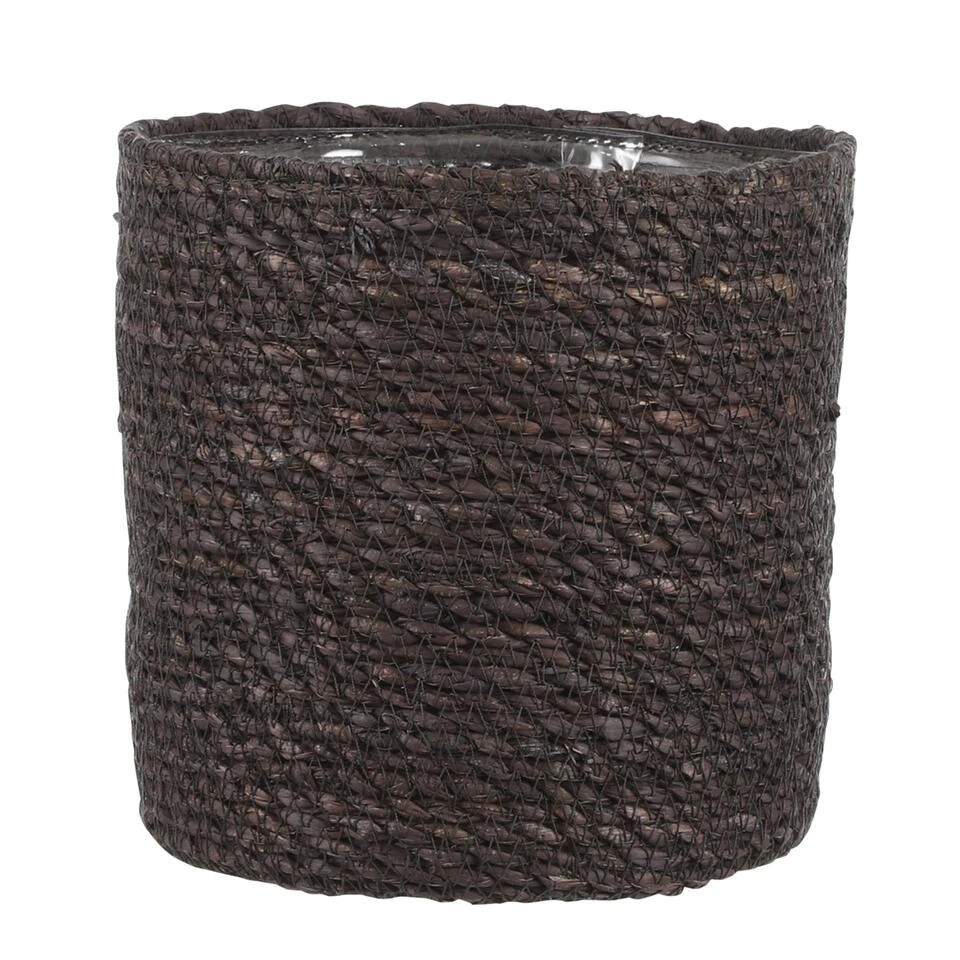 Naturel grijs kleur rotan planten pot mand van gedraaid jute/touw/riet/zeegras van 18 cm hoogte en 18 cm diameter(buitenzijde). Voor de binnenmaat trek je 3 cm af. Mooie rotan jute manden/mandjes voor bloemen, bloemstukjes en planten met plastic aan de binnenkant zodat het water er niet door gaat. De ronde rieten mand heeft geen gaatjes aan de onderkant.