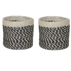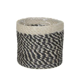 Naturel zwart kleur rotan planten pot mand van gedraaid jute/touw/riet/zeegras van 12 cm hoogte en 12 cm diameter(buitenzijde). Voor de binnenmaat trek je 2 cm af. Mooie rotan jute manden/mandjes voor bloemen, bloemstukjes en planten met plastic aan de binnenkant zodat het water er niet door gaat. De ronde rieten mand heeft geen gaatjes aan de onderkant.