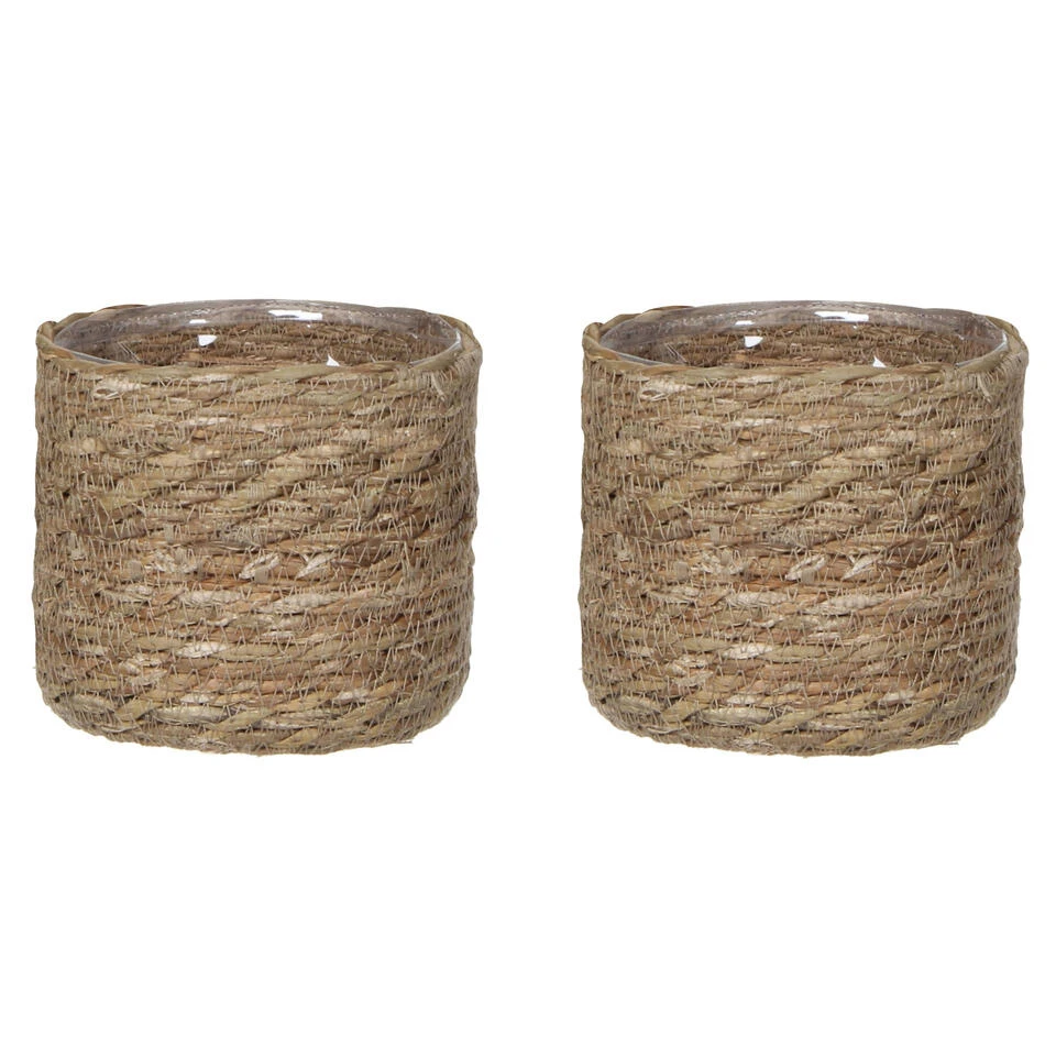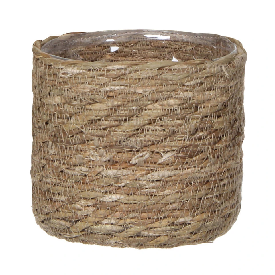 Naturel bruin kleur rotan planten pot mand van gedraaid jute/touw/riet/zeegras van 14 cm hoogte en 14 cm diameter(buitenzijde). Voor de binnenmaat trek je 2 cm af. Mooie rotan jute manden/mandjes voor bloemen, bloemstukjes en planten met plastic aan de binnenkant zodat het water er niet door gaat. De ronde rieten mand heeft geen gaatjes aan de onderkant.