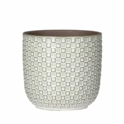 Plantenpot/bloempot van keramiek in de kleur wit met een mooi patroon. Diameter 13.5 cm en hoogte 13 cm. Stijlvolle bloempotten voor binnen gebruik met een glanzende finish. Serie: Daan. Het vierkantjes patroon aan de buitenzijde van de pot geeft het geheel een modieus fraai stijlvol uiterlijk. Handgemaakt keramiek.