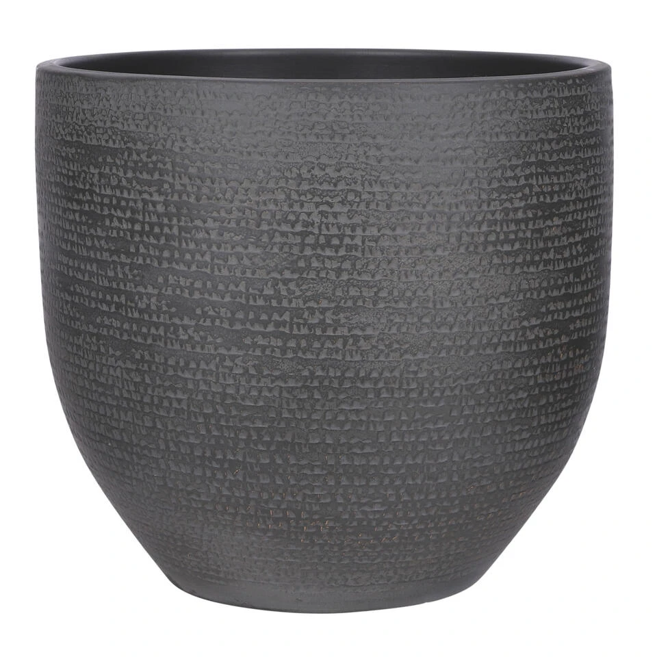 Plantenpot/bloempot van terracotta in de kleur zwart/grijs met een modern relief flakes patroon. Diameter 35 cm en hoogte 32 cm. Stijlvolle bloempotten voor binnen gebruik. Serie: Carrie. De zeer mooie potten met prachtige buitenzijde zijn met de hand gemaakt in Portugal. Derhalve is geen pot exact hetzelfde en hebben de bloempotten een echt karakter. Materiaal: Terracotta. Tip: zet een schotel onder de pot om eventueel lekken tegen te gaan. Potten van steen zijn niet 100% waterdicht.