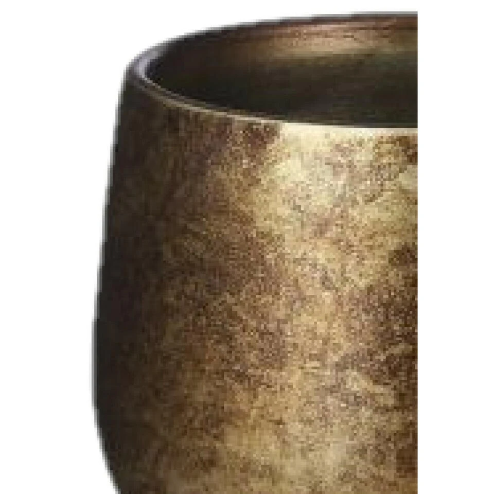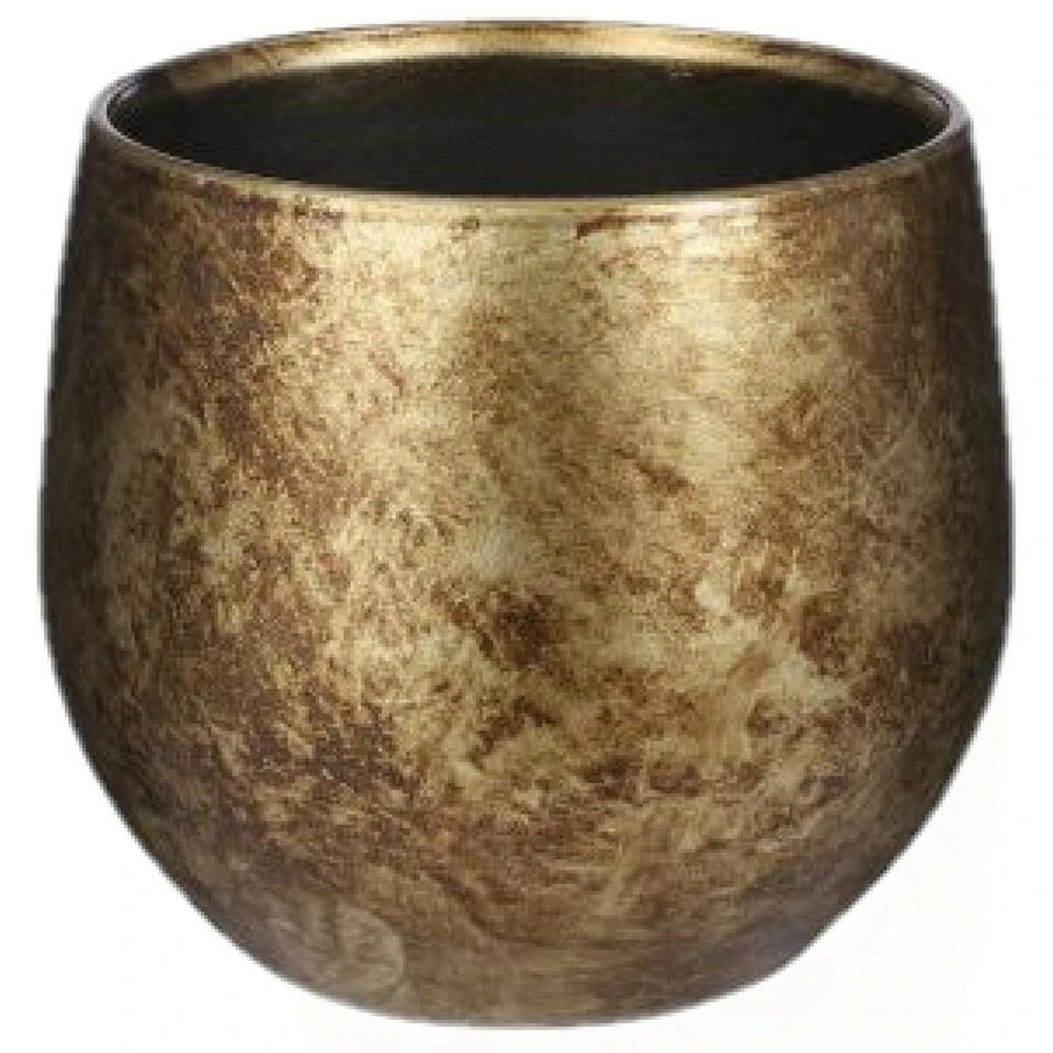 Plantenpot/bloempot van terracotta in de kleur goud met diameter 19 cm en hoogte 17 cm. Stijlvolle bloempotten voor binnen gebruik met metallic finish. Serie: Oliver. Deze terracotta pot is volledig met de hand gemaakt door traditionele Portugese pottenbakkers. Door de aandacht voor elke pot is elk stuk uniek. Bovendien geeft de bijzondere afwerking het een metaalachtig uiterlijk.