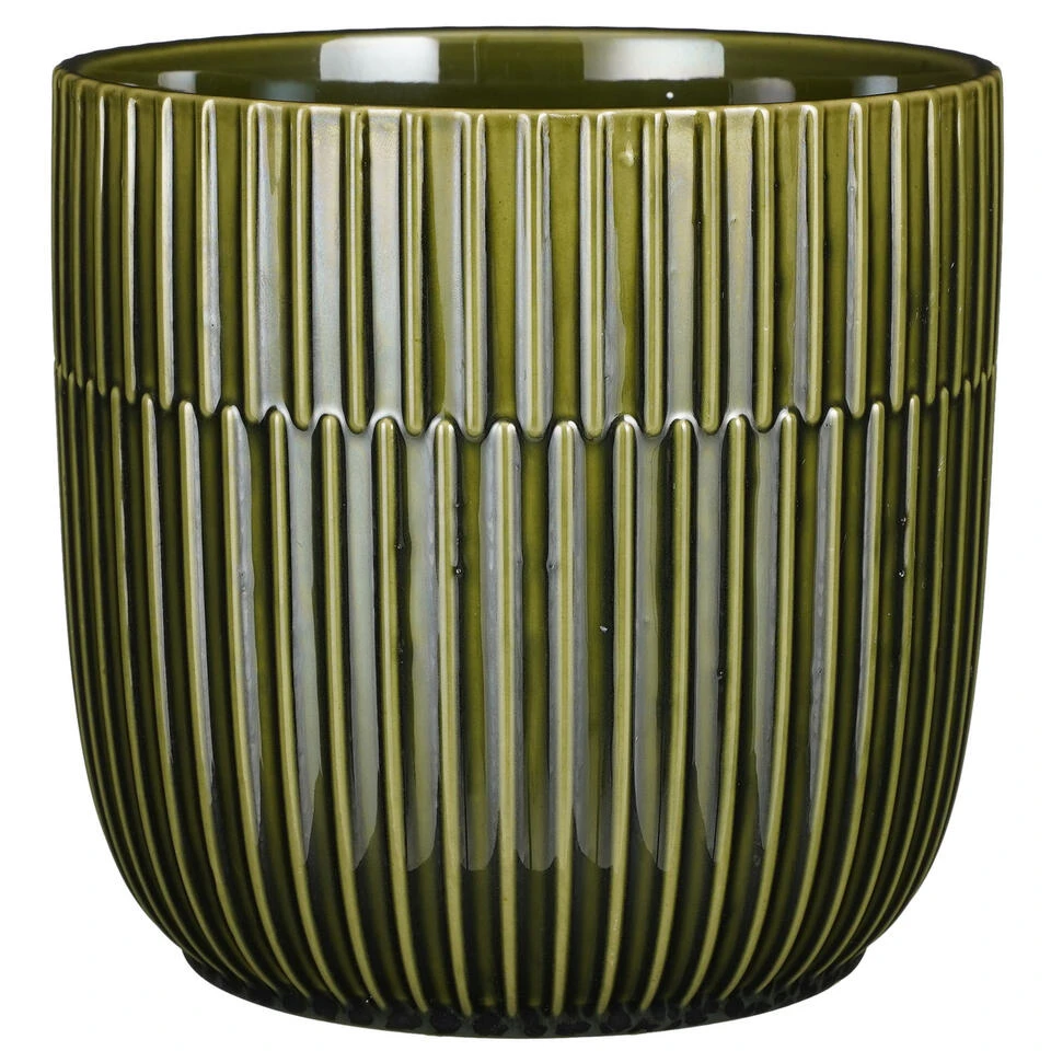Plantenpot/bloempot van keramiek in de kleur glans donkergroen met een mooi verticale strepen patroon. Diameter 19 cm en hoogte 18 cm. Stijlvolle bloempotten voor binnen gebruik. Serie: Sara. De stijlvolle pot met het prachtige patroon aan de buitenzijde is met de hand gemaakt in Portugal. Derhalve is geen pot exact hetzelfde en hebben de bloempotten een echt karakter. Tip: zet een schotel onder de pot om eventueel lekken tegen te gaan. Potten van steen zijn niet 100% waterdicht.