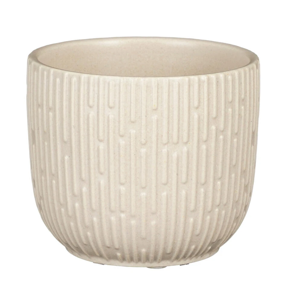 Plantenpot/bloempot van keramiek in de kleur mat wit met een mooi verticale strepen patroon. Diameter 11 cm en hoogte 9 cm. Stijlvolle bloempotten voor binnen gebruik. Serie: Sara. De stijlvolle pot met het prachtige patroon aan de buitenzijde is met de hand gemaakt in Portugal. Derhalve is geen pot exact hetzelfde en hebben de bloempotten een echt karakter. Tip: zet een schotel onder de pot om eventueel lekken tegen te gaan. Potten van steen zijn niet 100% waterdicht.