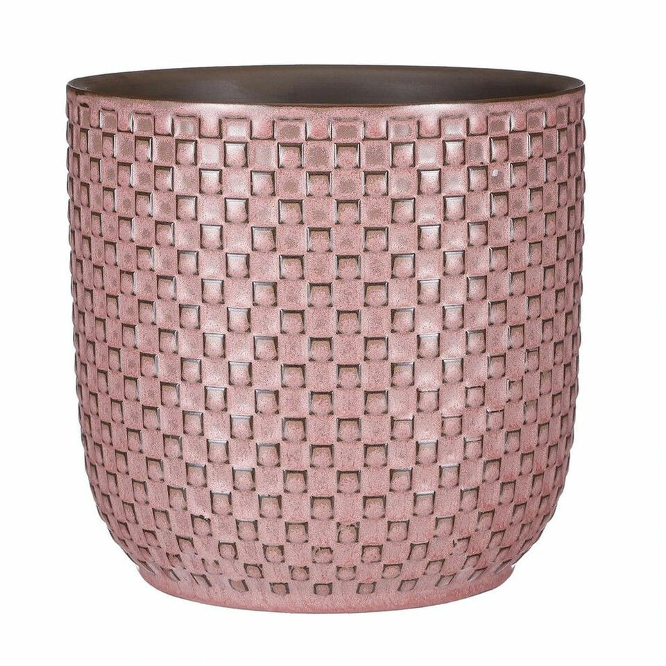 Plantenpot/bloempot van keramiek in de kleur roze met een mooi patroon. Diameter 19 cm en hoogte 17.5 cm. Stijlvolle bloempotten voor binnen gebruik met een glanzende finish. Serie: Daan. Het vierkantjes patroon aan de buitenzijde van de pot geeft het geheel een modieus fraai stijlvol uiterlijk. Handgemaakt keramiek.
