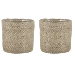 Naturel kleur rotan planten pot mand van gedraaid jute/touw/riet van 16 cm hoogte en 16 cm diameter(buitenzijde). Voor de binnenmaat trek je 3 cm af. Mooie rotan jute manden/mandjes voor bloemen, bloemstukjes en planten met plastic aan de binnenkant zodat het water er niet door gaat. De ronde rieten mand heeft geen gaatjes aan de onderkant.