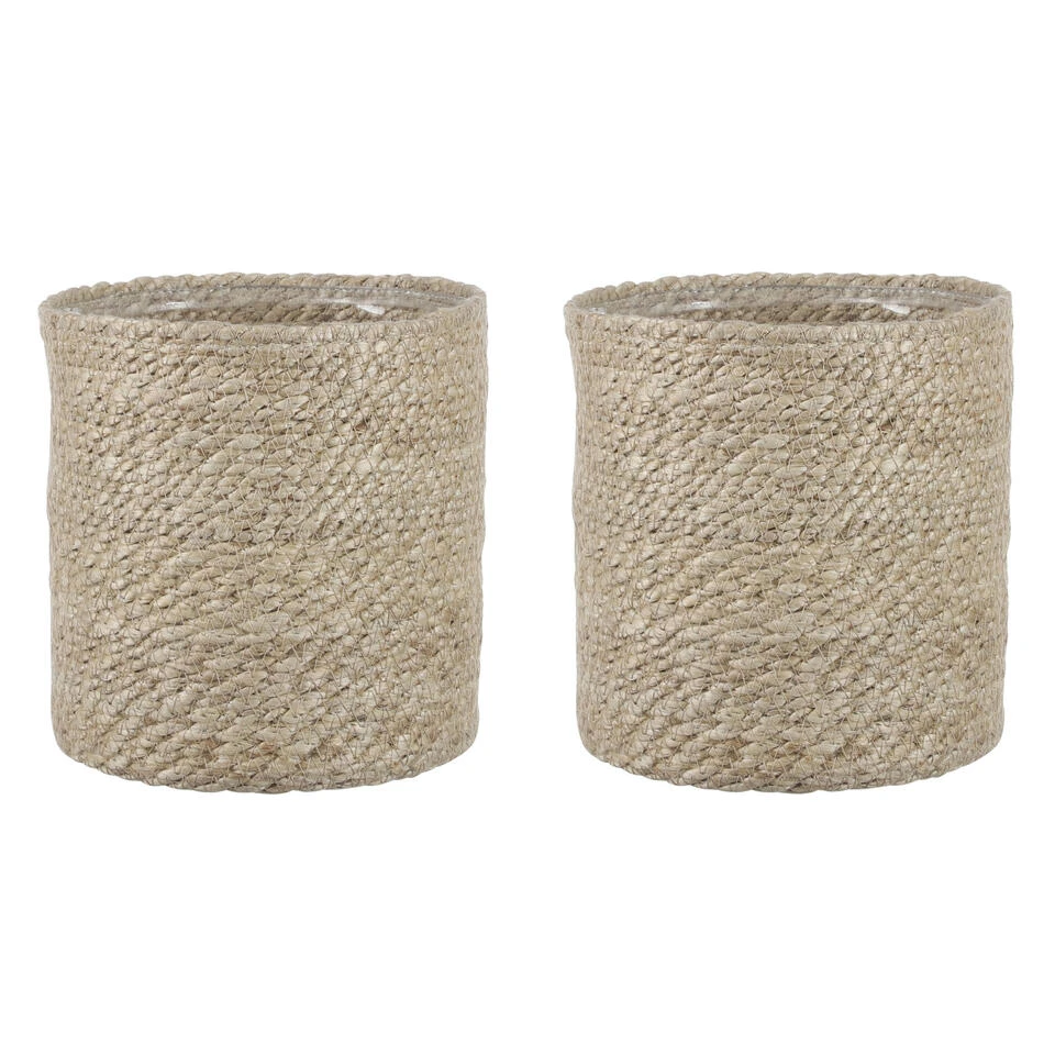 Naturel kleur rotan planten pot mand van gedraaid jute/touw/riet van 18 cm hoogte en 18 cm diameter(buitenzijde). Voor de binnenmaat trek je 3 cm af. Mooie rotan jute manden/mandjes voor bloemen, bloemstukjes en planten met plastic aan de binnenkant zodat het water er niet door gaat. De ronde rieten mand heeft geen gaatjes aan de onderkant.