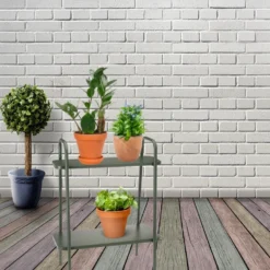 Dit Orange85 plantenrek is een echte blikvanger in uw woonkamer, tuin of patio. Gebruik van dit 2-laagse rek is een ruimtebesparende manier om meerdere planten en bloemen kwijt te kunnen. Het rek heeft een matgroene kleur en is geschikt voor zowel binnen als buiten gebruik. Dit product is eenvoudig in elkaar te zetten met de bijgeleverde schroeven.