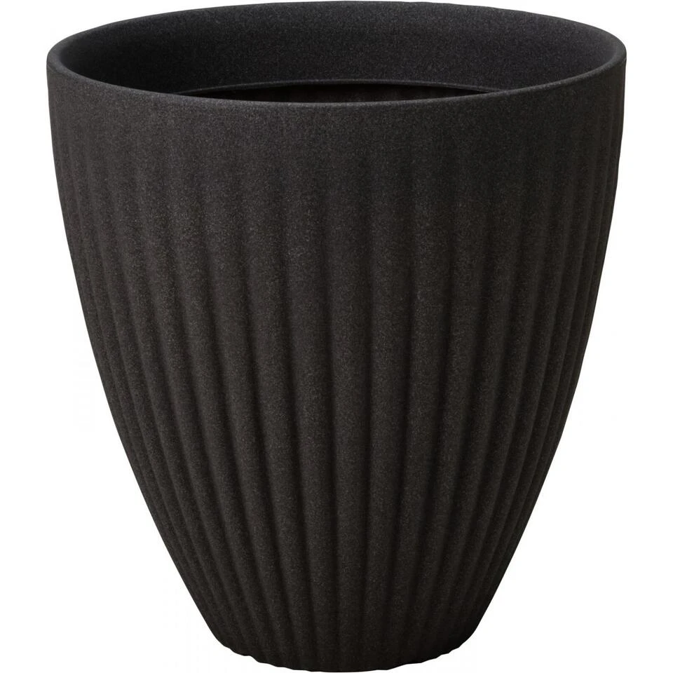 Plantenpot/bloempot gemaakt van kunststof(Polyethyleen) in de kleur antraciet grijs met relief strepen aan de buitenzijde. Deze prachtige bloempot uit de Roma serie is een schitterende toevoeging aan uw tuin/terras. De pot is dubbelwandig aan de bovenkant. Voor buiten gebruik. Ronde vorm.