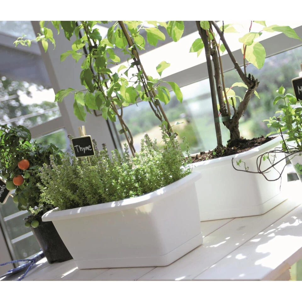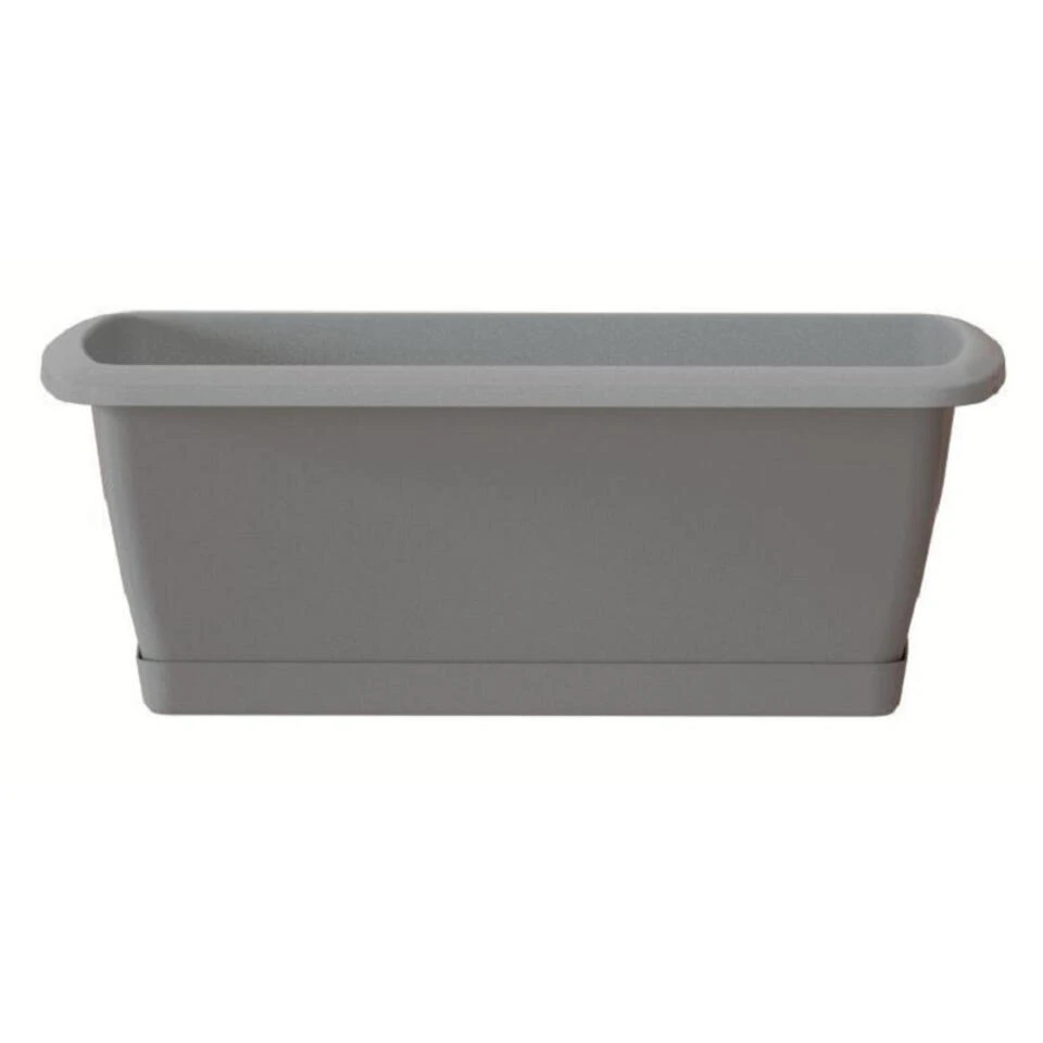 1x Kunststof Respana plantenbak/bloembak lichtgrijs 59 cm inclusief onderzetter. Kras en stootvaste bloembak/plantenbak, voorzien van een onderzetter. De bloembakken/plantenbakken zijn geschikt voor binnen en buiten gebruik. Serie: Respana set. Formaat: lengte ca 59 cm. Breedte: ca 18,4 cm. Hoogte: ca 15 cm.