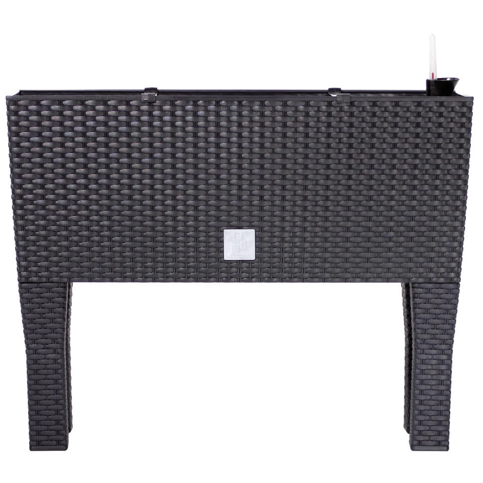 Bloembak/plantenbak op poten met ingebouwd irrigatie systeem inclusief waterniveau meter. Serie: Rato. Formaat: lengte: ca 60 cm. Breedte: ca 25 cm. Hoogte: ca 46 cm. Inhoud: 30 liter. Materiaal: kras en stootvast kunststof. De aarde in de plantenbak wordt door een drainageplaat gescheiden van een waterreservoir. De hoeveelheid water kan worden afgelezen aan de stand van de rode vlotter. Het waterreservoir is gemakkelijk bij te vullen via een buis aan de bovenkant van de bak. Geschikt voor binnen en buiten gebruik.