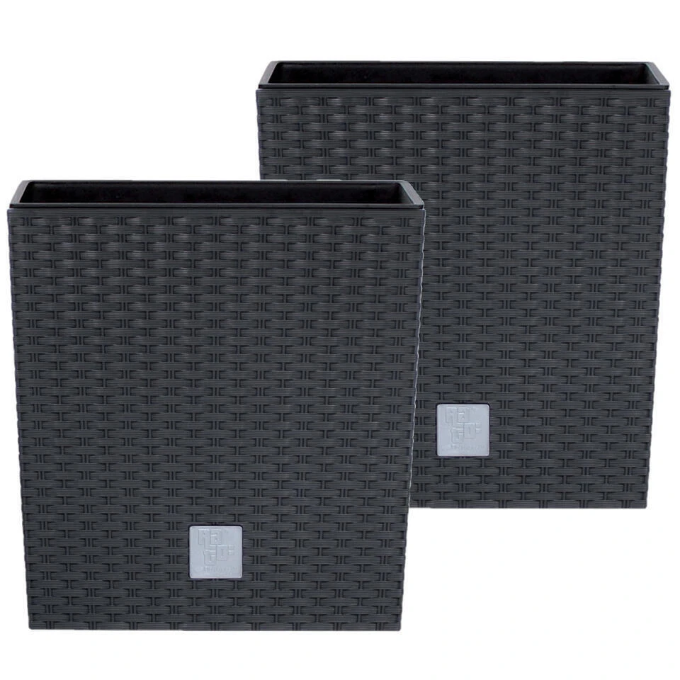 Kunststof Rato rotan bloempot/plantenpot antraciet 26 cm. Kras en stootvast met rotanvlechtwerk uitstraling. Inclusief uitneembare binnenpot/binnenbak, zonder afwateringsgaten. De bloempotten/plantenpotten zijn geschikt voor binnen en buiten gebruik. Afmetingen(LxBxH):26 x 26 x 26.6 cm. Inhoud: 11 liter inclusief binnenpot, 15,8 liter exclusief binnenpot.