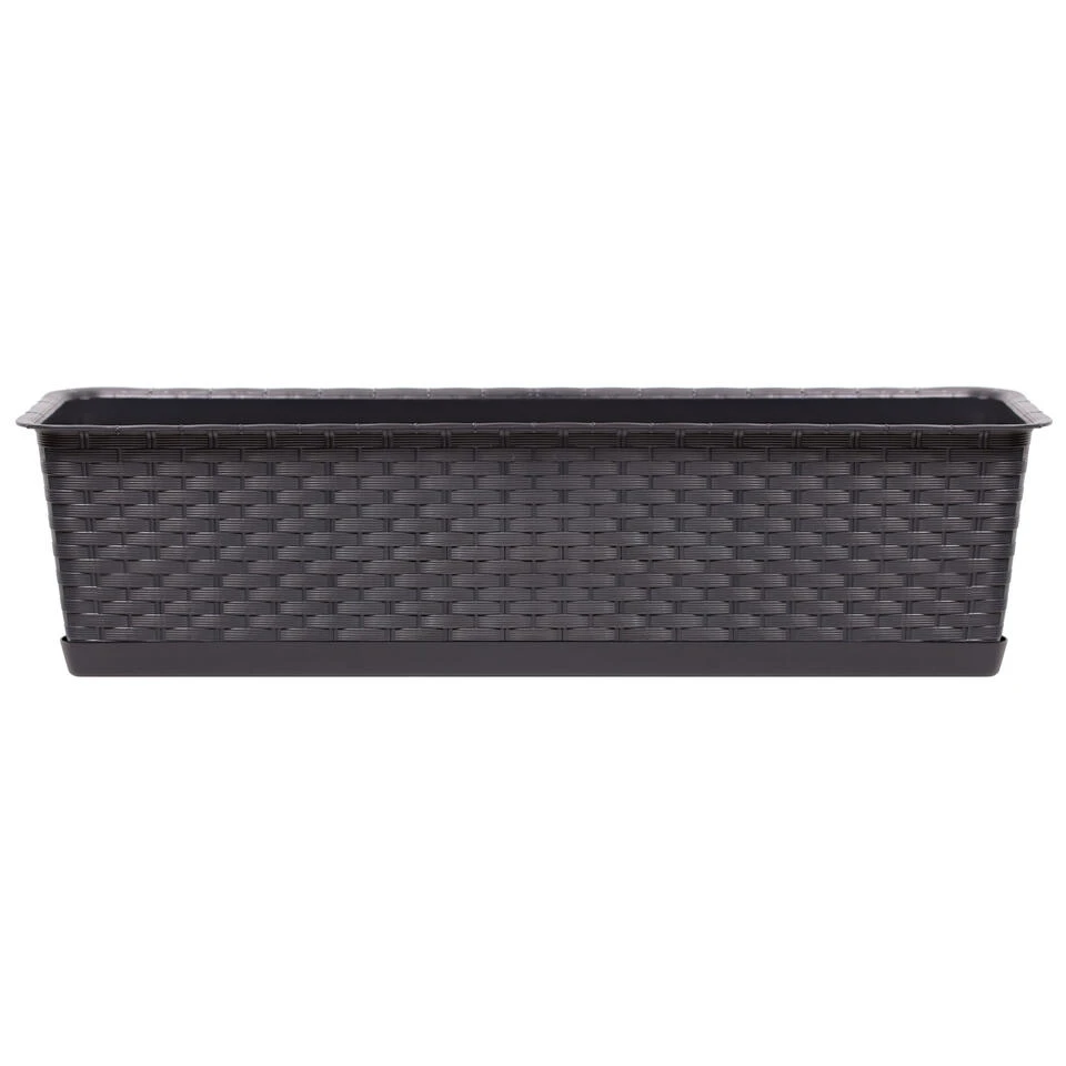 Kunststof Ratolla rotan plantenbak/bloembak/balkonbak set donkerbruin 10 liter met bijpassende opvangschotel/opvangbak. Kras en stootvaste bloembak/plantenbak met rotan vlechtwerk uitstraling. Zonder afwateringsgaten, deze kunt u naar wens zelf maken. De bloembakken/plantenbakken zijn geschikt voor binnen en buiten gebruik. Serie: ratolla case. Formaat: lengte ca 60 cm. Breedte: ca 17,3 cm. Hoogte: ca 14,5 cm. Inhoud: 10 liter.