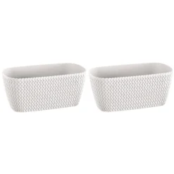 1x Kunststof splofy plantenbak/bloembak wit 30 cm. Kras en stootvaste bloembak/plantenbak met de uitstraling van zachte, grof gebreide wol. De bloembakken/plantenbakken zijn geschikt voor binnen en buiten gebruik. Serie: Splofy. Formaat: lengte ca 29,7 cm. Breedte: ca 14,5 cm. Hoogte: ca 13,3 cm. Materiaal: kunststof.