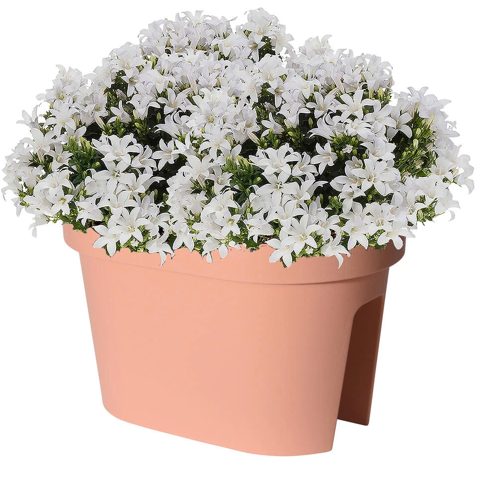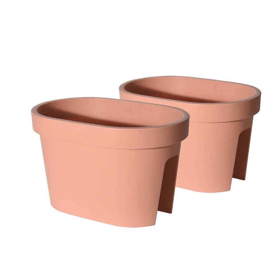 Balkon plantenpot/bloempot terra cotta ovaal. Formaat: lengte ca 39,6 cm. Breedte ca 26,6 cm. Hoogte ca 25 cm. Inhoud: 12,3 liter. Materiaal: kunststof. Kras en stootvast, zonder gaten. Geschikt voor binnen en buiten gebruik.