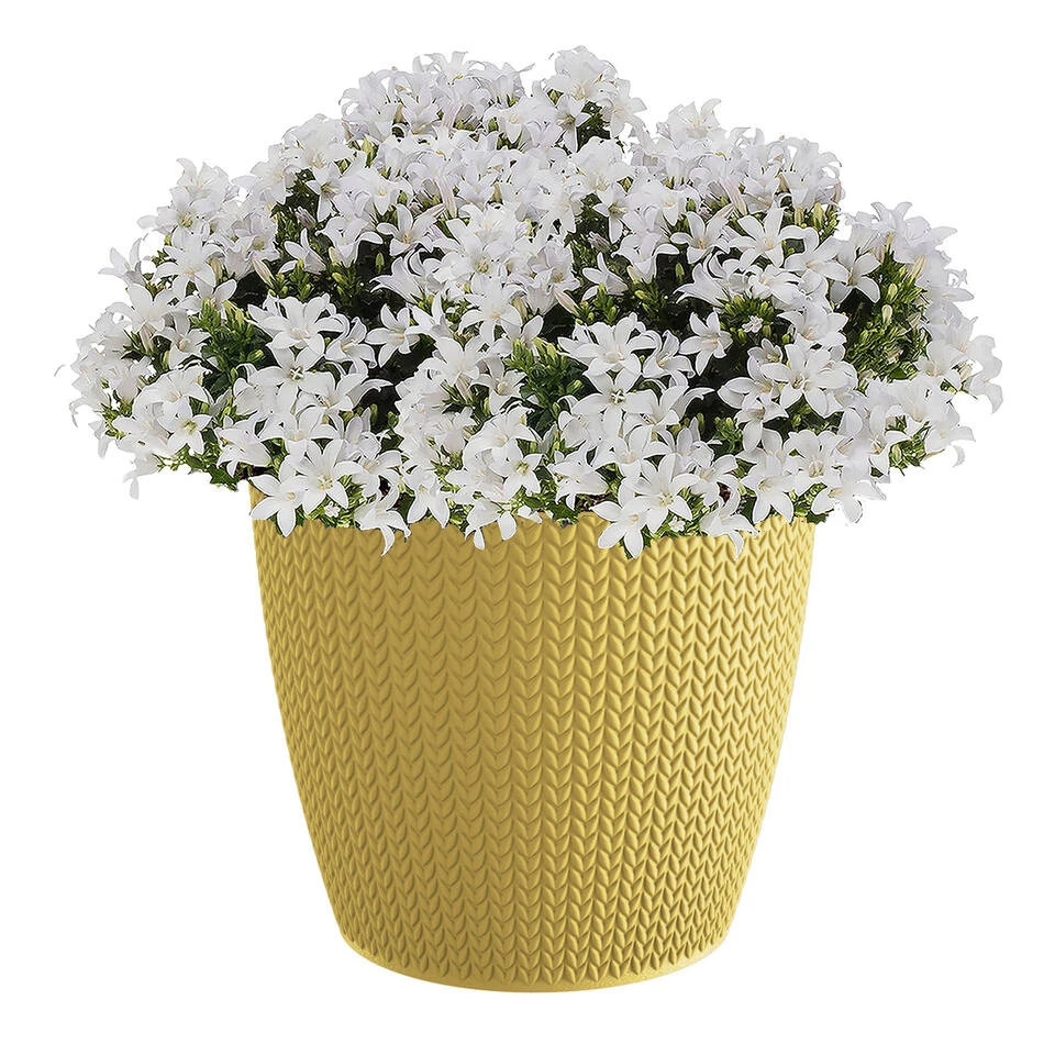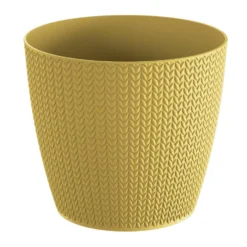 Stijlvolle plantenpot/bloempot van kunststof met diameter 22 cm en hoogte 19 cm in het mosterd geel. Uit de Wheatys serie. Geschikt voor buiten en binnen. Vorstbestendig ja. Basic plantenpotten voor in de tuin, balkon of binnen.