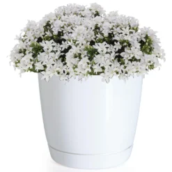 Plantenpot/bloempot kunststof rond glanzend parel wit dia 21 x hoogte 19 cm. Geschikt voor buiten en voornamelijk binnen. Vorstbestendig ja. Mooie stralende plantenpotten voor in de tuin, serre, balkon of binnen. Met overtollig water opvangbak voor makkelijker binnen gebruik.