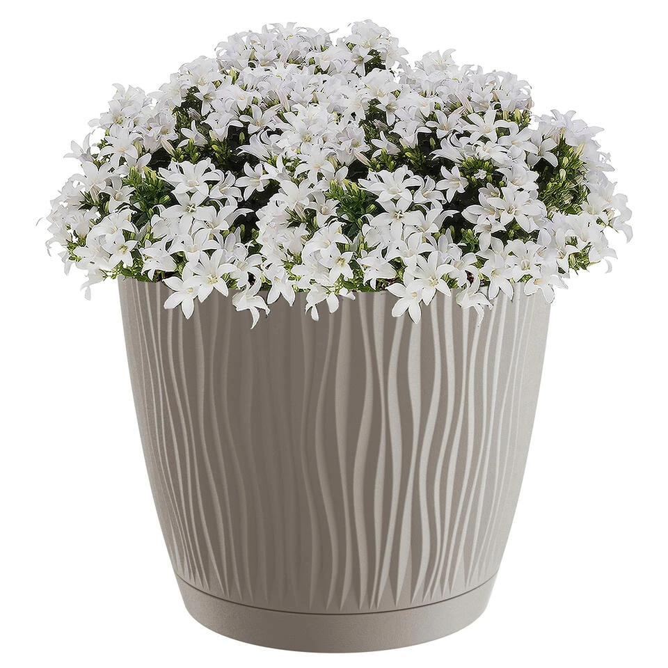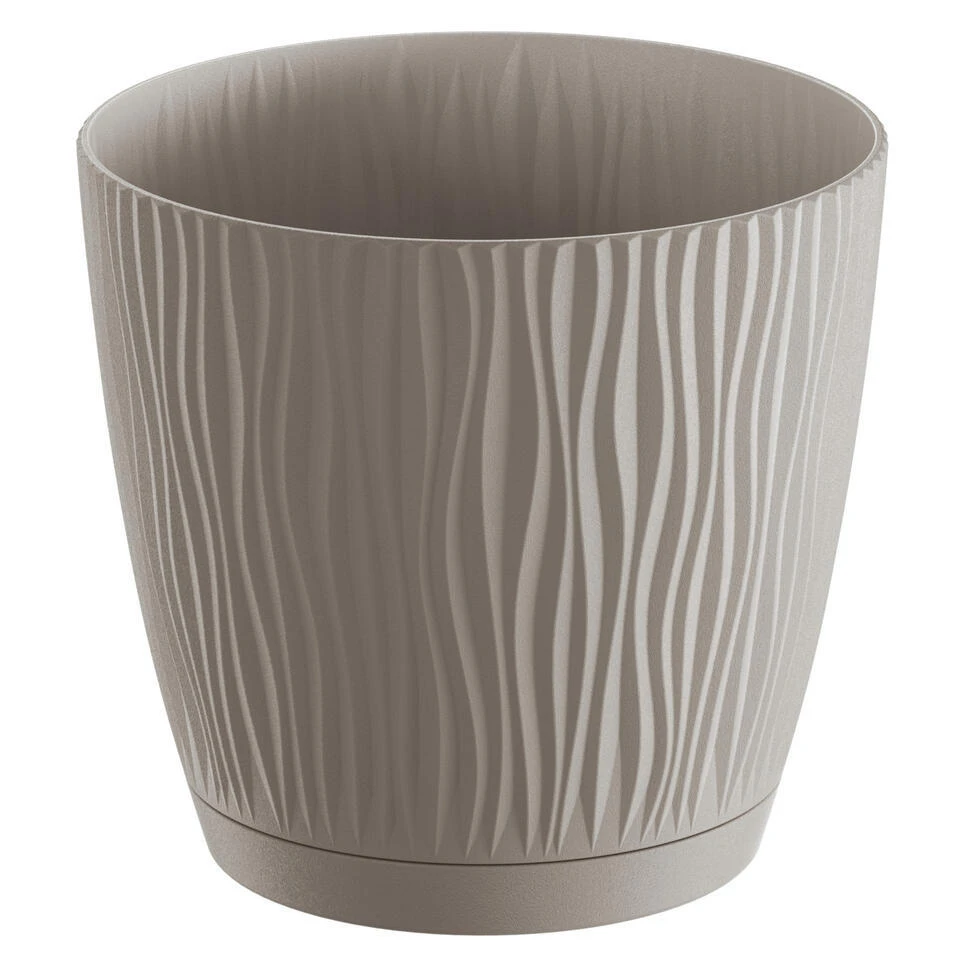 Stijlvolle kunststof plantenpot/bloempot dia 28 cm/hoogte 26 cm Waves taupe. Geschikt voor buiten en binnen. Vorstbestendig ja. Mooie plantenpotten voor in de tuin, balkon, kantoor of in de woonkamer.