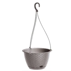 Hangende plantenpot/bloempot kunststof dia 22 cm/hoogte 14 cm taupe/beige. Geschikt voor buiten. Vorstbestendig ja. Plantenpotten voor in de tuin of balkon. Rotan gevlochten bloempotten met kunststof ophanghaak
