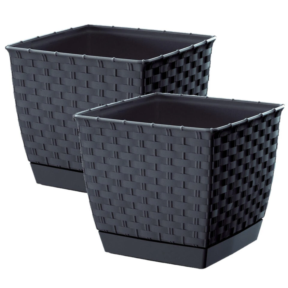 Plantenpot/bloempot rotan kunststof 19 x 19 cm en hoogte 16 cm antraciet grijs. Geschikt voor buiten en binnen. Mooie stijlvolle gevlochten kunststof uitstraling. Vorstbestendig ja. Basic vierkante plantenpotten voor in de tuin, balkon of binnen met water opvangbak.