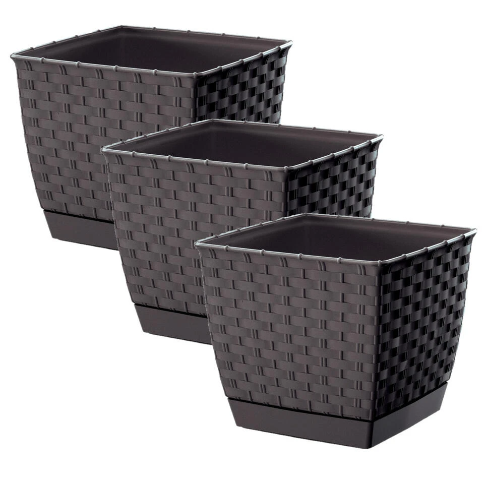 Plantenpot/bloempot rotan kunststof 22 x 22 cm en hoogte 19 cm donkerbruin. Geschikt voor buiten en binnen. Mooie stijlvolle gevlochten kunststof uitstraling. Vorstbestendig ja. Basic vierkante plantenpotten voor in de tuin, balkon of binnen met water opvangbak.