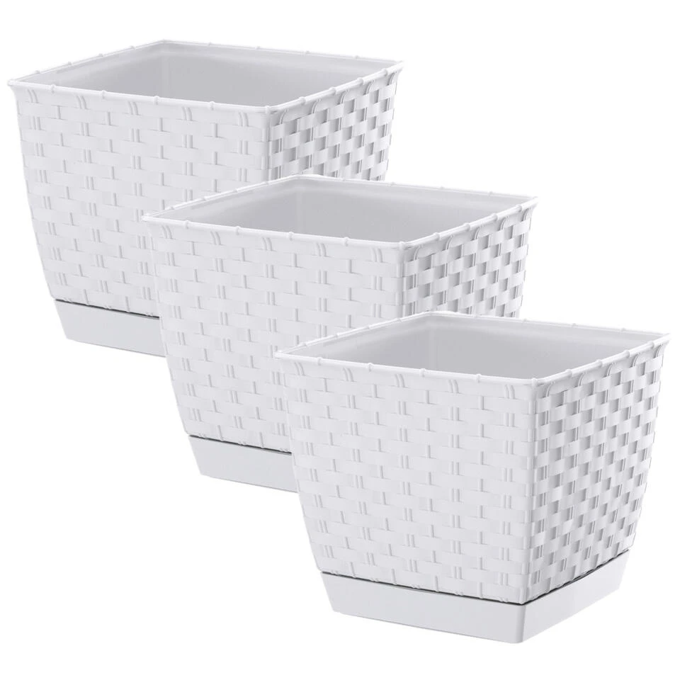 Plantenpot/bloempot rotan kunststof 25 x 25 cm en hoogte 22 cm parel wit. Geschikt voor buiten en binnen. Mooie stijlvolle gevlochten kunststof uitstraling. Vorstbestendig ja. Basic vierkante plantenpotten voor in de tuin, balkon of binnen met water opvangbak.