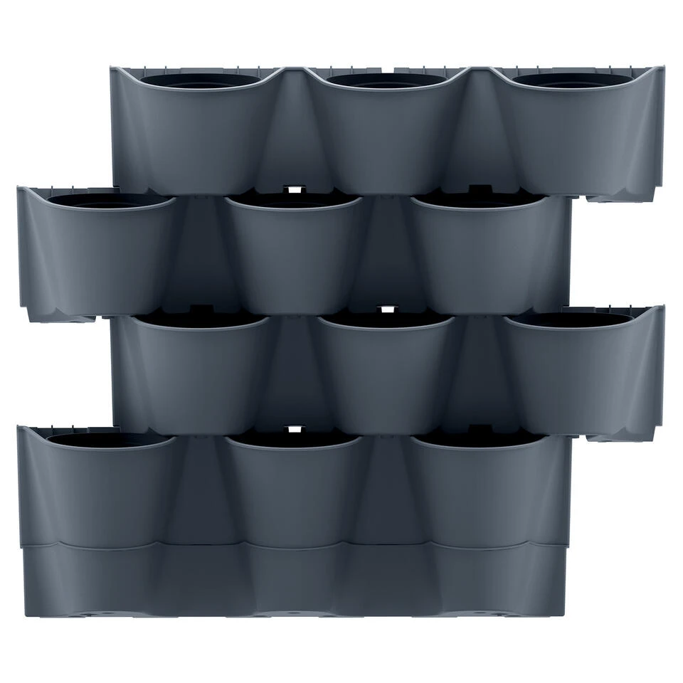 Uw eigen verticale tuin met dit modulaire hangende kunststof plantenpotten systeem. Het modulaire systeem staat toe de potten middels verschillende configuraties te monteren. Dankzij het doorstroomde irrigatiesysteem worden de planten gelijkmatig van water voorzien. In set zitten 12 plantenpotten.
