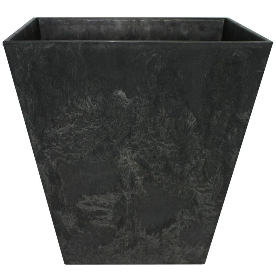 Bloempot/plantenpot vierkant van gerecycled kunststof en steenpoeder in de kleur zwart/betonlook met diameter 15 cm en hoogte 15 cm. Artstone Ella serie potten voor buitenplanten, binnenplanten of kunstplanten. Een unieke duurzame mix van materialen dat nu geen afval is, maar een prachtige duurzame bloempot, 100% recyclebaar. Deze serie potten hebben een eigen drainagesysteem onderin de pot met water plug zodat ze geschikt zijn voor binnen en buiten.