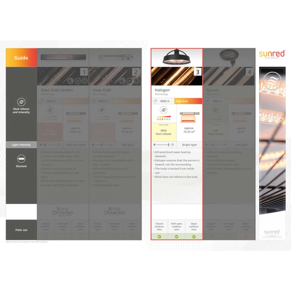De halogeentechnologie en de aangebrachte laag koolstof en roségoud zorgen voor extra reflectie van het verwarmingselement. Dit geeft een intens gevoel van warmte. Dankzij de 180°-draaifunctie blijf je zowel links als rechts van de kachel behaaglijk warm. Bovendien zijn de zogenaamde “Ultra Low Glare” elementen nu een trend. De lichtuitvoer van de middengolfelementen van de Indox is met 80% verminderd. Samen met de milde reflectie gebruikt het halogeenelement ook een middengolf. Het lichaam wordt dus van binnenuit verwarmd, en de wind heeft geen invloed op de warmteverdeling. De halogeentechnologie zorgt ervoor dat de persoon de warmte ontvangt, in plaats van de omgeving.