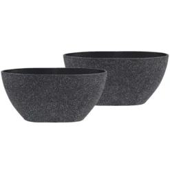 Bloempot/plantenpot balkonbak van gerecycled kunststof en steenpoeder in de kleur zwart met diameter 36 x 16 cm en hoogte 16 cm. Potten voor buitenplanten of kunstplanten. Deze plantenpot voor buiten heeft een stijlvolle uitstraling. Een unieke duurzame mix van materialen dat nu geen afval is, maar een prachtige duurzame bloempot. Een sterke, mooie pot die vriendelijk is voor het milieu en de portemonnee. De pot heeft gaatjes in de onderkant dus een opvangbalkonbak is voor binnen gebruik vereist. Zoeknaam serie voor de balkonbak is Nova concrete zwart. Deze serie potten hebben een eigen drainagesysteem onderin de pot.