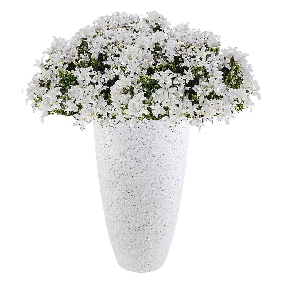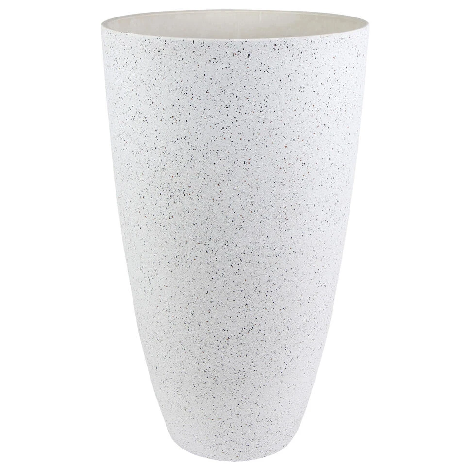 Hoge bloempot/plantenpot of vaas van gerecycled kunststof en steenpoeder in de kleur wit met diameter 29 cm en hoogte 50 cm. Potten/vazen voor kamerplanten, buitenplanten, bloemen of kunstplanten. Deze bleoemenvaas/pot voor binnen en buiten heeft een stijlvolle uitstraling in elk interieur. Een unieke duurzame mix van materialen dat nu geen afval is, maar een prachtige duurzame bloempot. Een sterke, mooie pot die vriendelijk is voor het milieu en de portemonnee. De pot/vaas heeft gaatjes in de onderkant dus een opvangschaal is voor binnen gebruik vereist. Zoeknaam serie voor de schaal is Nova concrete wit. Deze serie potten hebben een eigen drainagesysteem onderin de pot.
