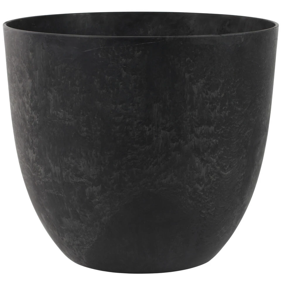 Bloempot/plantenpot van gerecycled kunststof en steenpoeder in de kleur zwart met diameter 38 cm en hoogte 33 cm. Potten voor buitenplanten of kunstplanten. Deze plantenpot voor binnen of buiten heeft een stijlvolle warme uitstraling in elke tuin, huis of balkon. Een unieke duurzame mix van materialen dat nu geen afval is, maar een prachtige duurzame bloempot. Een sterke, mooie pot die vriendelijk is voor het milieu en de portemonnee. De pot heeft gaatjes met plug in de onderkant. Zoeknaam serie voor de schaal is Artstone Bola zwart. Deze serie potten hebben een eigen drainagesysteem onderin de pot. Artstone planters zijn 100% recyclebaar.