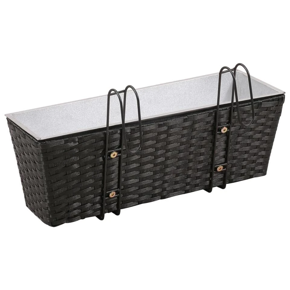 Deze prachtige hangplantenbakkenset bestaat uit 2 rattan potten en 2 uitneembare zinken potten. De rattan is gemaakt van duurzaam waterbestendig wicker waardoor deze plantenbakken een perfecte aanvulling op je buitenruimte zijn. Ze passen op bijna alle balkonrailings.